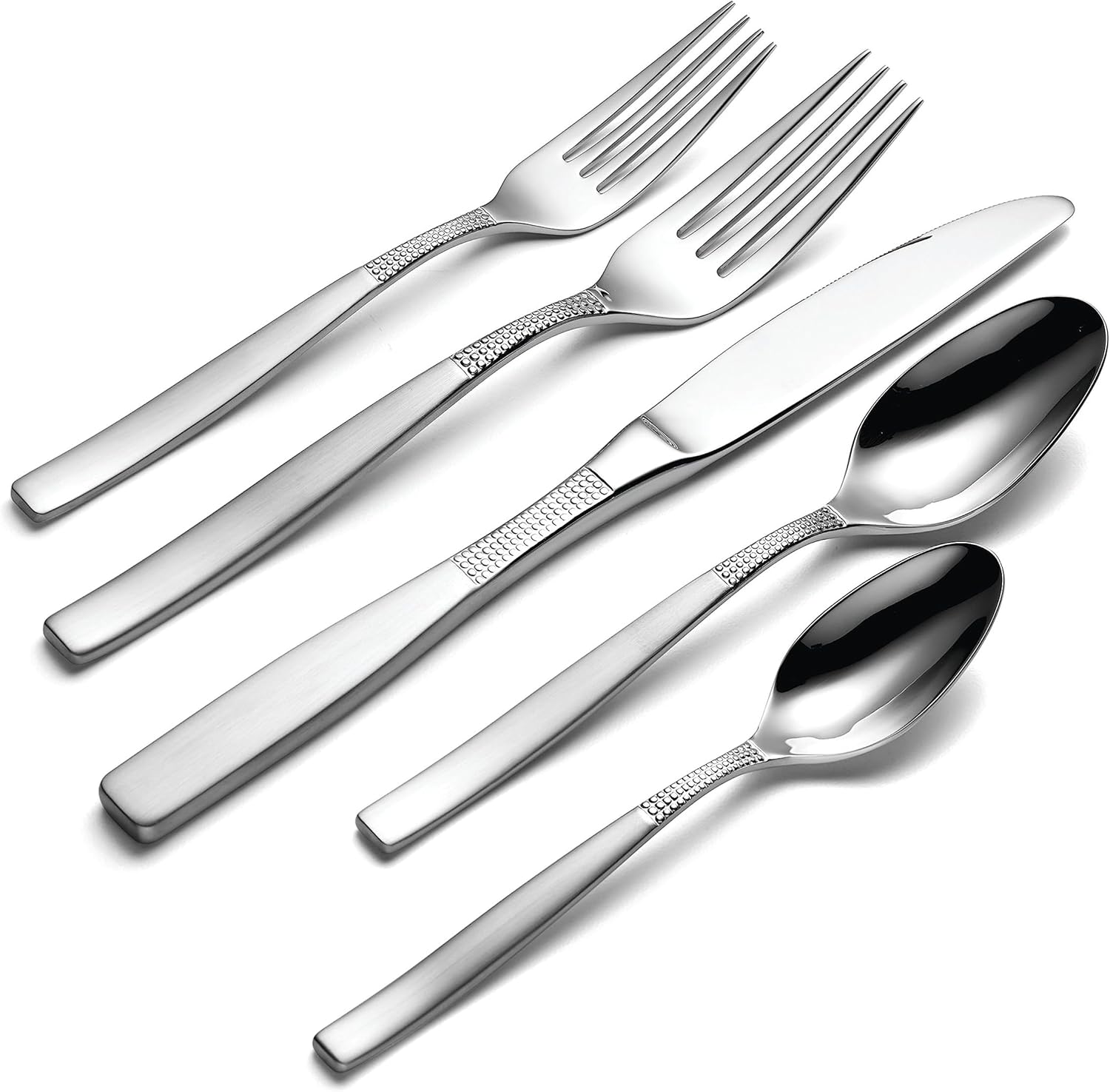 - Includes (8) 5 piece place settings, (8) extra teaspoons, and (1) 5 piece serving set