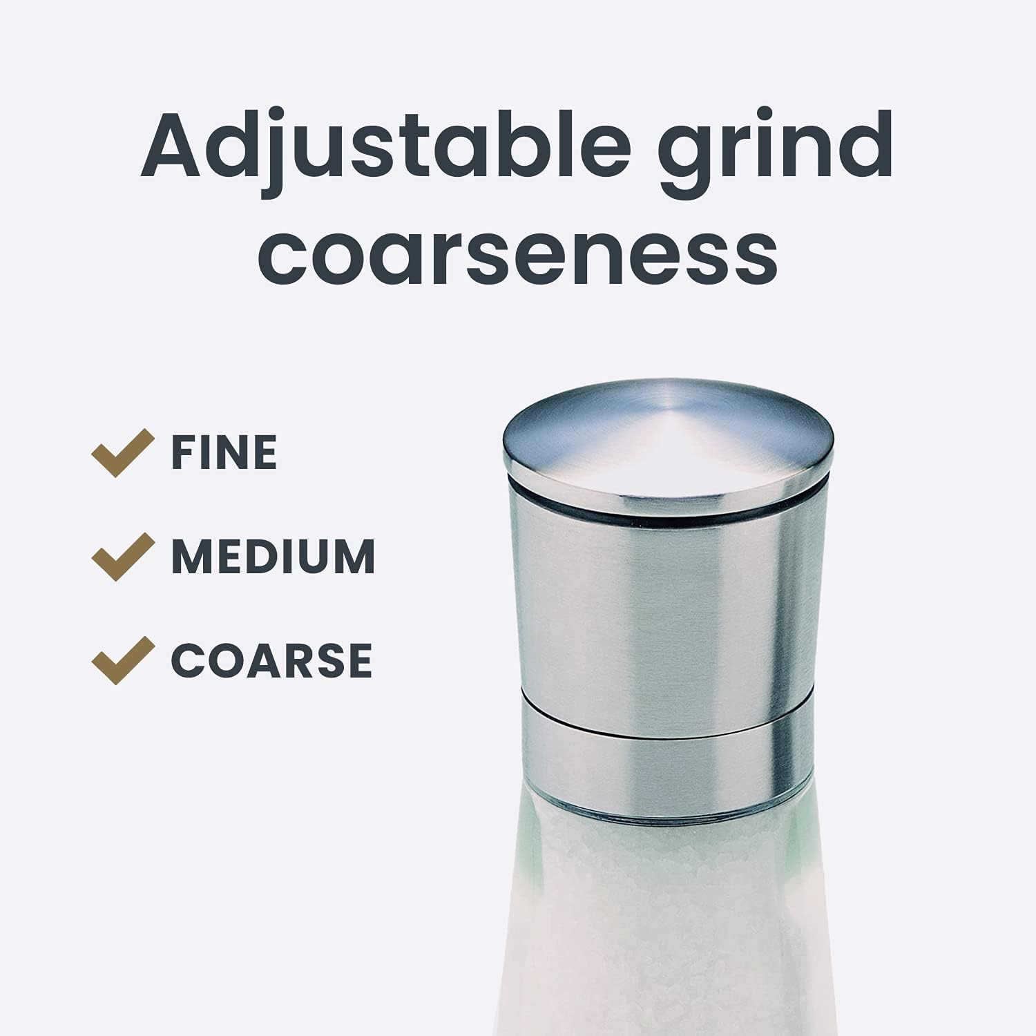 - Customizable grinding: This professional-quality ceramic salt mill is fully adjustable from fine to coarse, able to provide whatever grind size your recipe book calls for. Simply loosen top nut for coarse particles & tighten for fine.