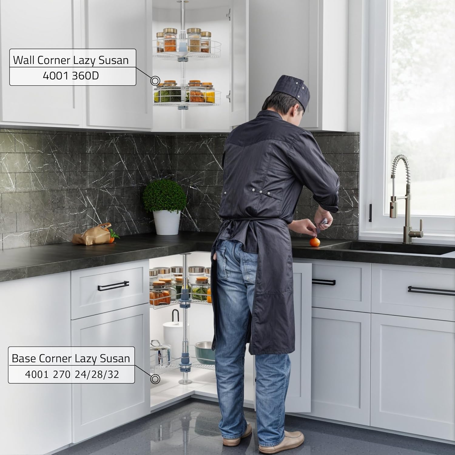 - DESIGNED FOR WALL CORNER CABINETS: Each shelf is round (also called 360 degrees) in order to fit easily inside a wall corner kitchen cabinet with a hinged diagonal door. The actual diameter of the lazy susan is 18" so the cabinet depth is 19". No part of the lazy susan will attach to the door. Final assembly must be completed inside the cabinet to ensure fit.