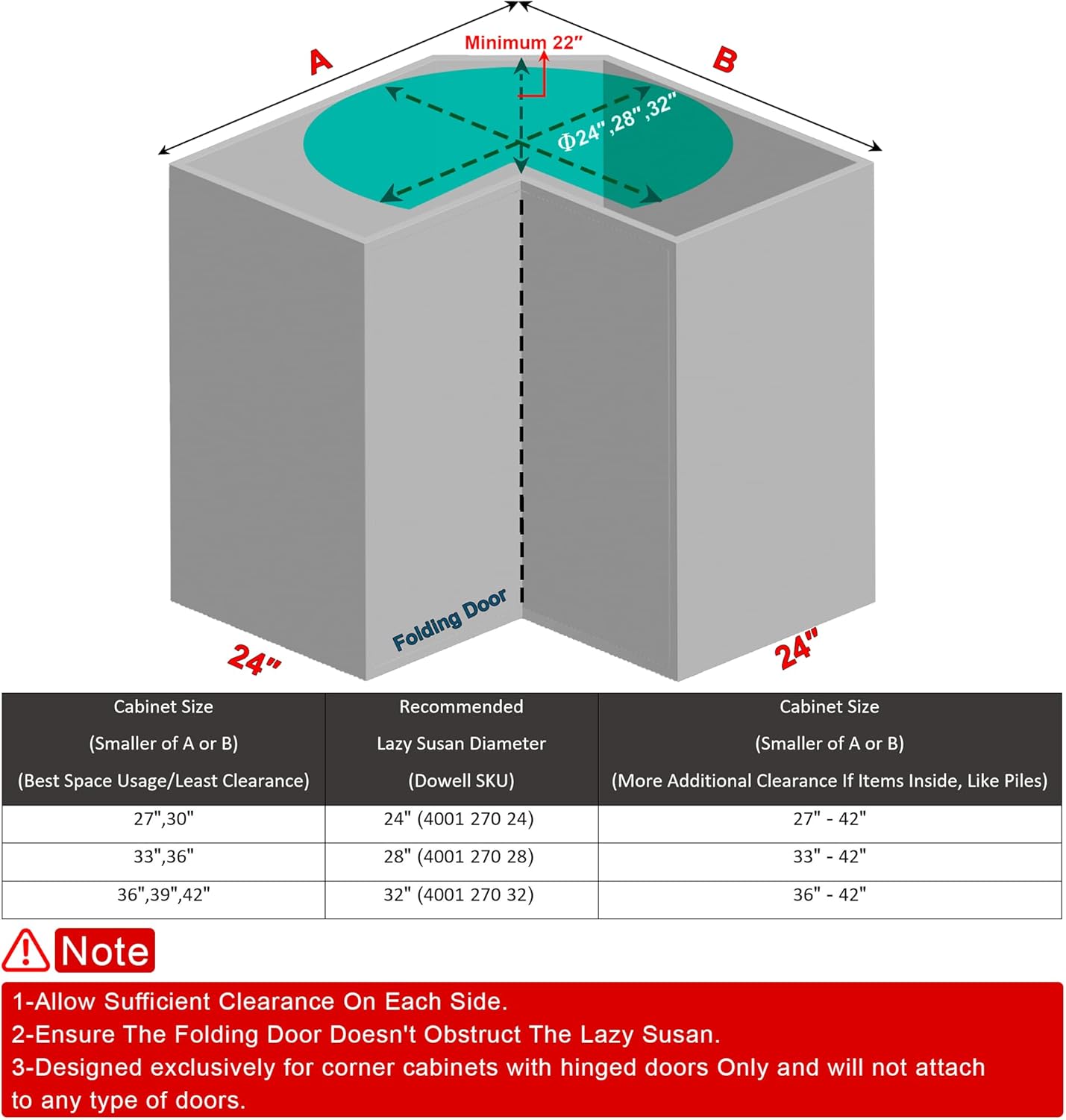 - DESIGNED FOR BASE CORNER CABINETS: Each shelf is kidney shaped (also called pie shaped or 270 degrees) in order to fit easily inside a base corner kitchen cabinet with a hinged diagonal door. The actual diameter of the lazy susan is 24" so the ideal cabinet size is 27" with an internal clearance of 30". No part of the lazy susan will attach to the door. Final assembly must be completed inside the cabinet to ensure fit.