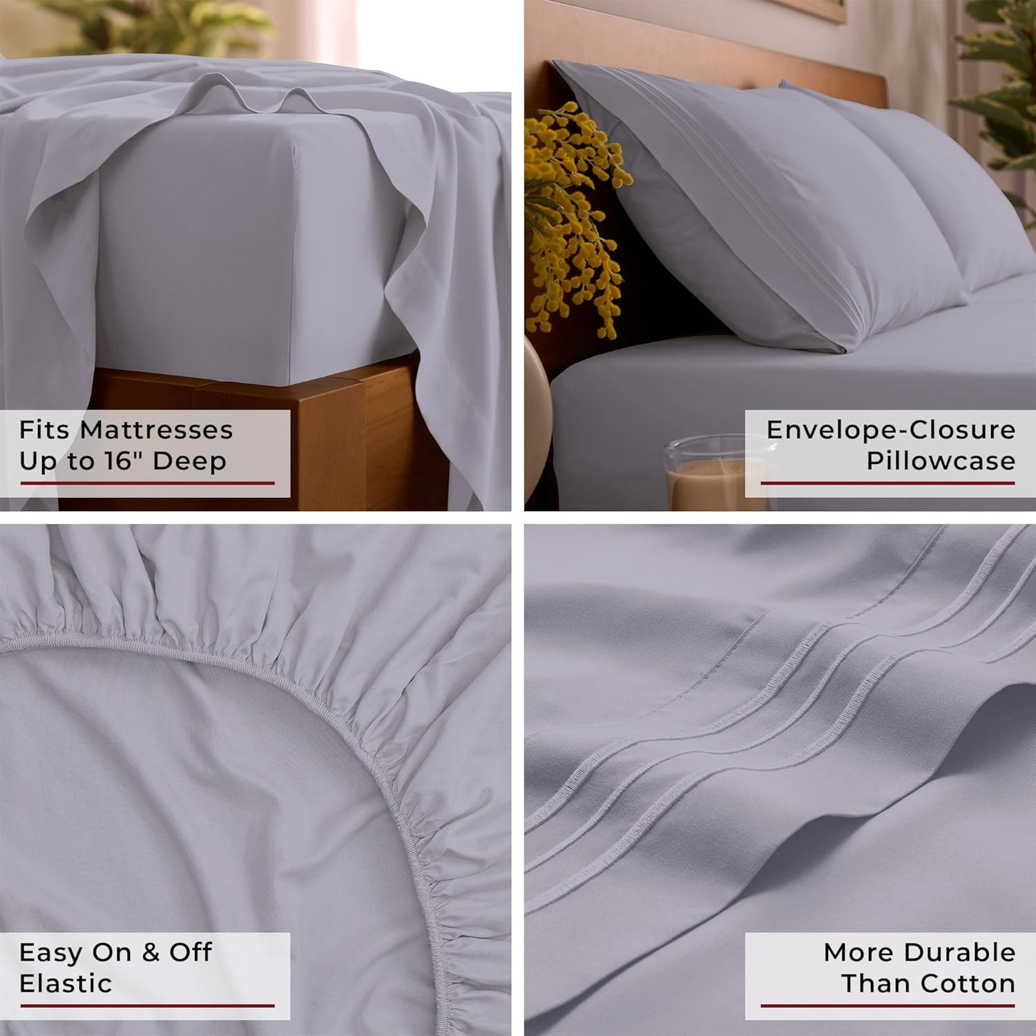 - Complete 4-Piece Queen Bedding Set - Includes 1 Fitted Sheet (80"x60"x16"), 1 Flat Sheet (102"x90"), & 2 Pillowcases (20"x30") - all crafted from double-brushed microfiber for an ultra-soft feel. Temperature-regulating to keep you cozy in winter and cool in summer.