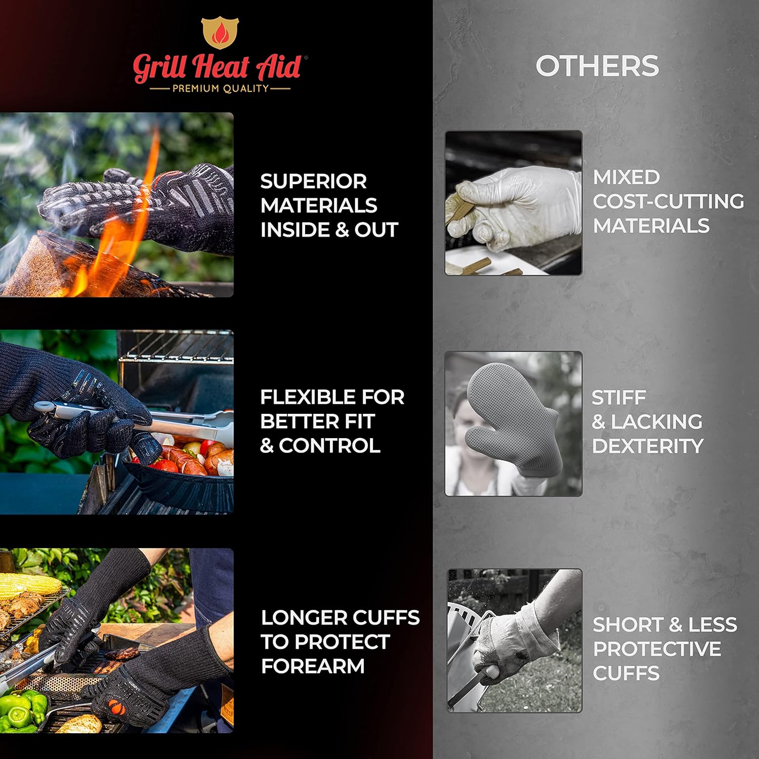GRILL HEAT AID BBQ Grill Gloves Heat Proof for Grilling ā Fireproof 1472°F Heat-Resistant Grill Mitts for Outdoor Barbecue and Smoker, Campfire, Fire Pit, Oven Glove with Fingers for Baking Pizza