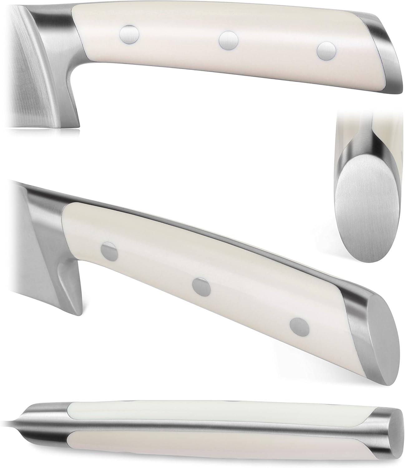 - Hand crafted full tang knives forged from tight grained, X50CrMoV15 German Steel for incredible durability, stain resistance and exceptional edge retention.