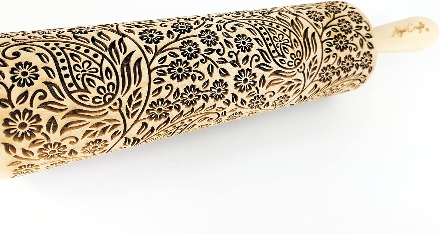 KASHMIR pattern Embossed Rolling Pin. Engraved Dough Roller with Paisley for Embossed Cookies and Pottery by Algis Crafts