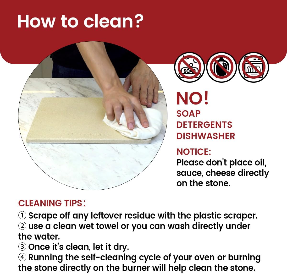 - Product Care Instructions : Store the clean stone in a ventilated dry place, the pizza stone must be kept dry.