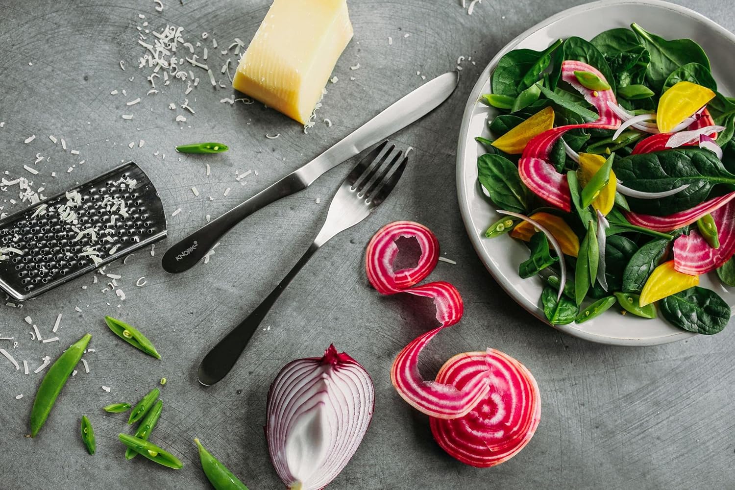 - Signature forks have built in cutting powers (round thinned tines and a beveled edge) allows the user to safely rock thru foods. All of the utensils feature a finger platform and contoured handle for comfort and leverage.