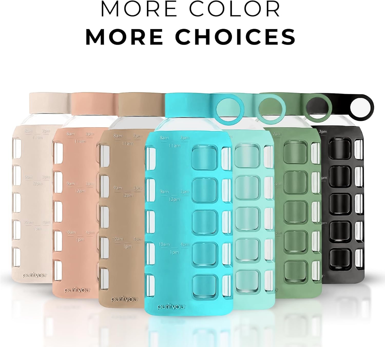 purifyou 40oz / 32oz / 22oz / 12oz Borosilicate Glass Water Bottle with Time & Volume Markers, Silicone Sleeve, Stainless Steel Lid – Reusable Glass Bottle for Water & Juice (22oz Aqua Blue)
