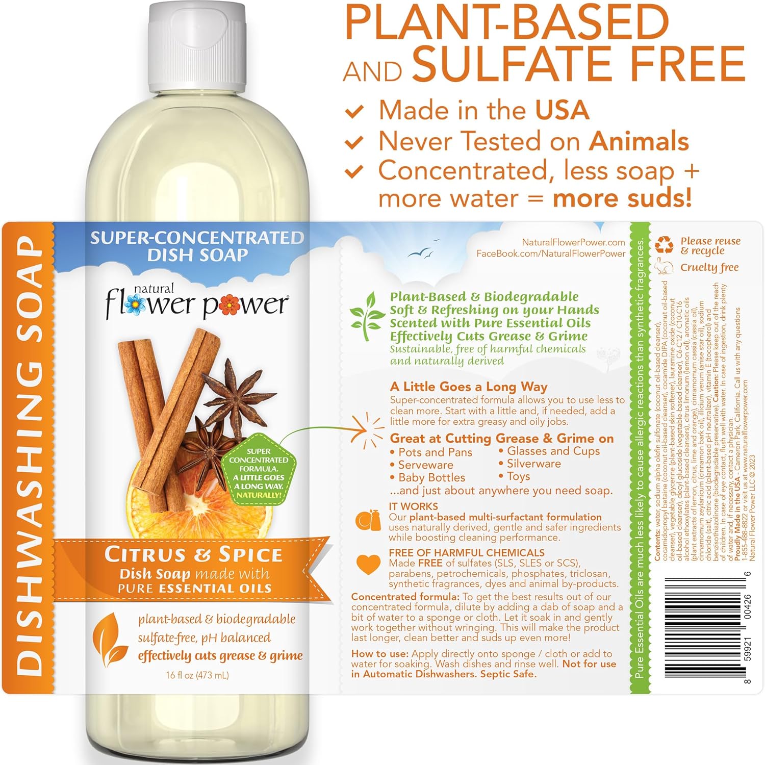 - Super concentrated yet gentle on skin, Natural Flower Power’s dish soaps cut through grease and grime on dishes, pots, pans, utensils, glassware, baby bottles, pet bowls, countertops, and more