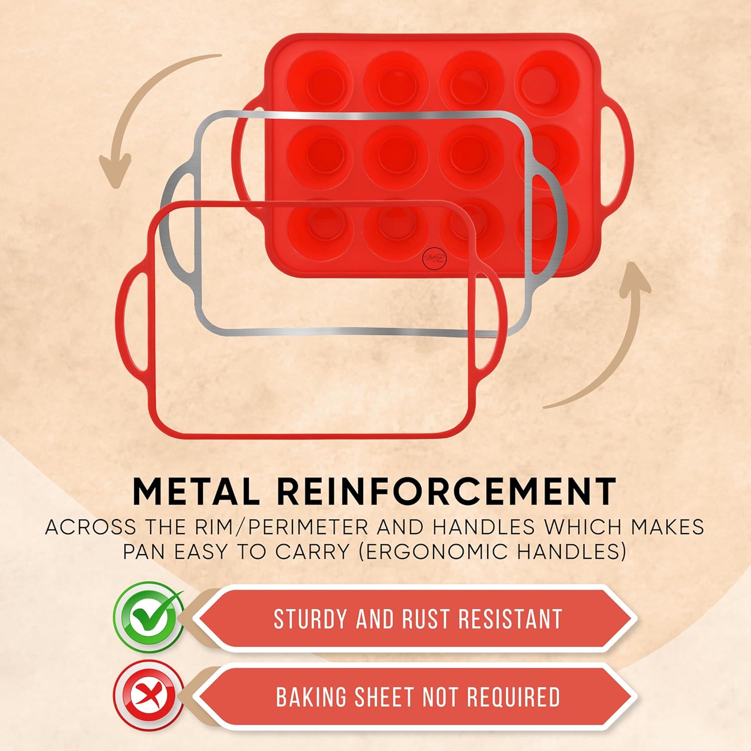 Silicone Muffin Pan With Handles, 12 Cups Cupcake Pan, Silicone Muffin Cups For Baking, Eggs & Cupcakes, Non-Stick Cupcake Molds Dishwasher Safe & BPA Free - Red Color
