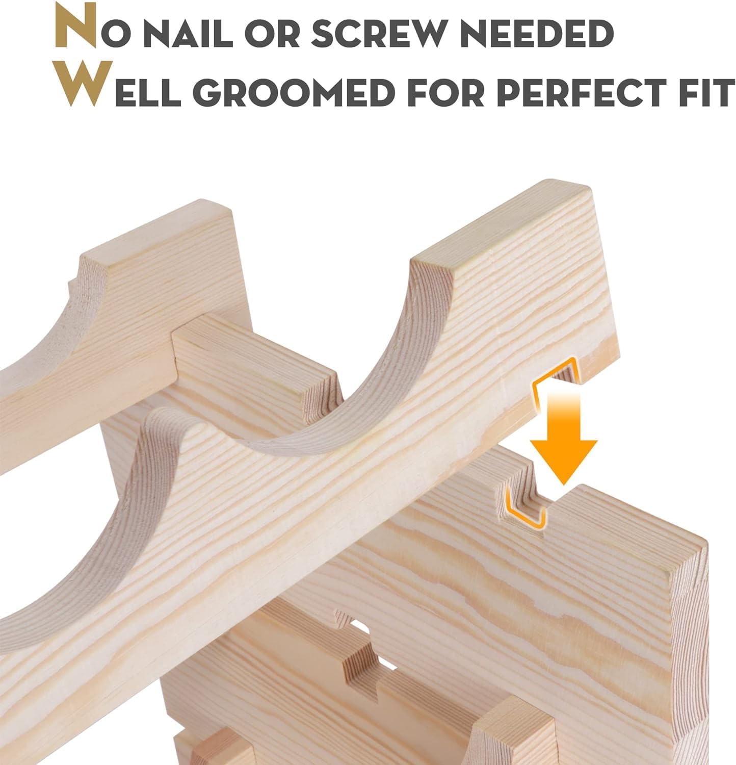- ăSolid Pine Wood - Sturdy & Wobble-FreeăThis wine bottle holder is made of high quality knots free pine wood to ensure sturdy construction and compact capacity. The thickness of this hardwood is 0.71 inch, smooth and solid material to ensure your wines' safety for long time usage. Unfinished natural wood offers a variety options to stain, paint, varnish to match your furnishings or just leave as it is, 100% DIY and wobble-free guarantee