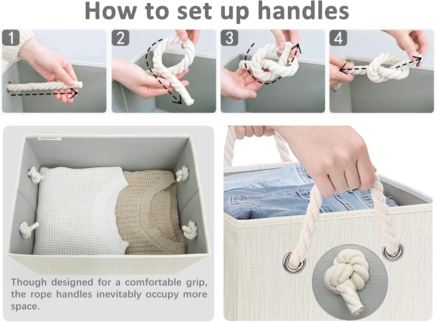 - The storage basket with 2 soft rope handles can support a weight of up to 30 pounds.