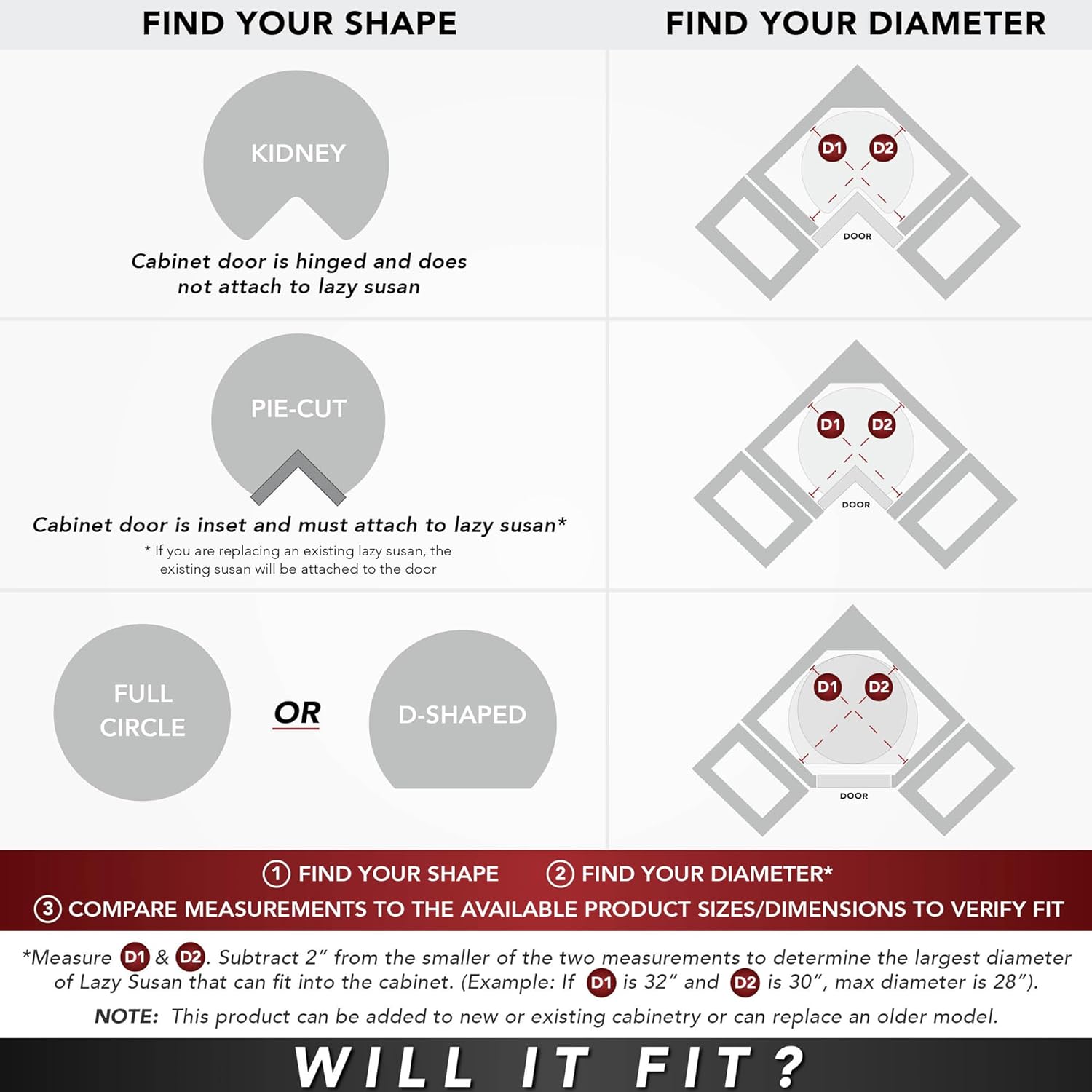 - Pie-Cut 2-Shelf Lazy Susans: Effortlessly organize your space with our Polymer Pie-Cut Two-Tier Lazy Susans for Corner Base Cabinets; dimensions: 28" W x 18.25” D x 26" H; weight per square foot: 20 lb.