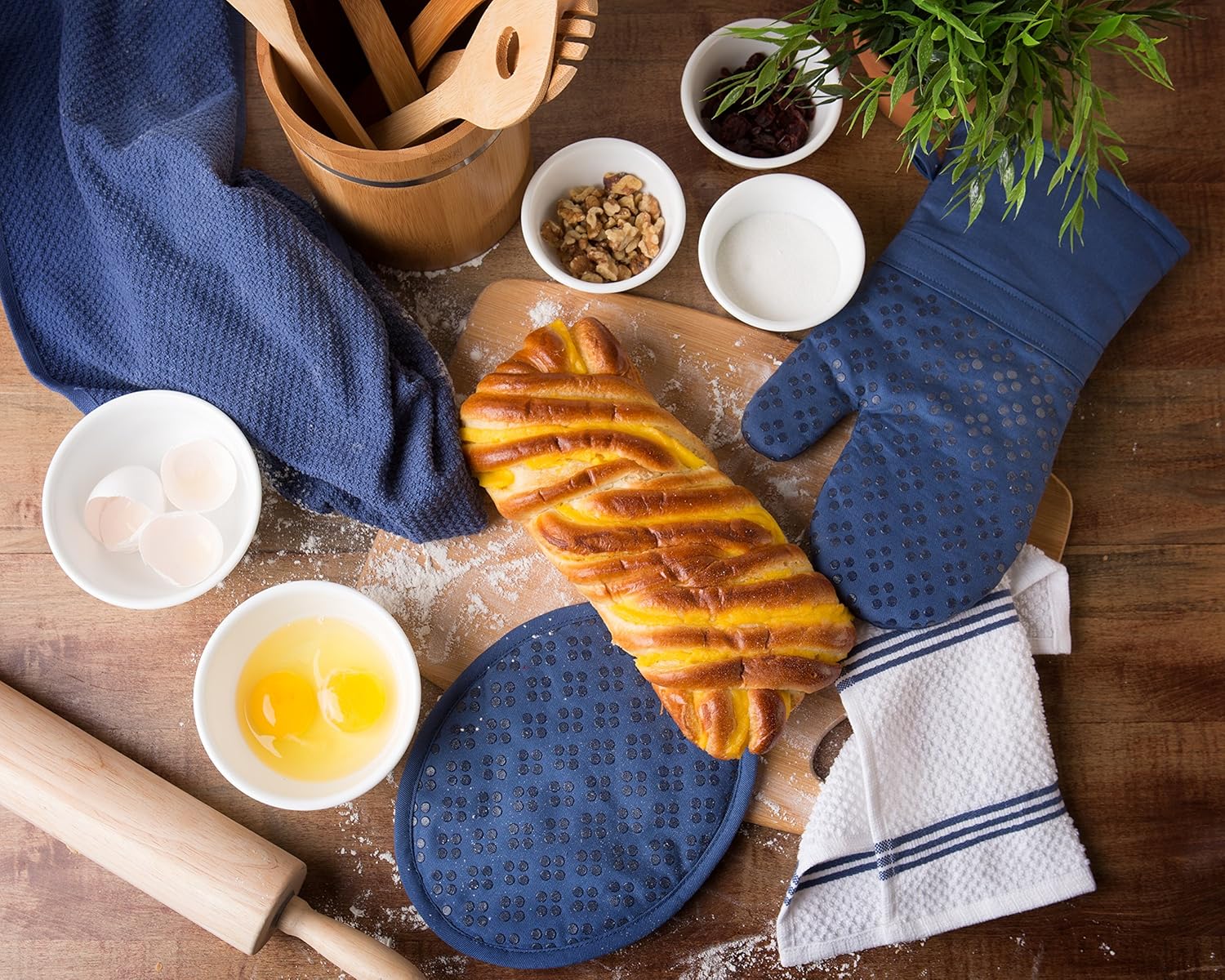Sticky Toffee 9-Piece Kitchen Set – Dark Blue 100% Cotton Terry Dish Towels, Dishcloths, Oven Mitts, and Pot Holders with Non-Slip Silicone Grip, Oeko-Tex Cotton