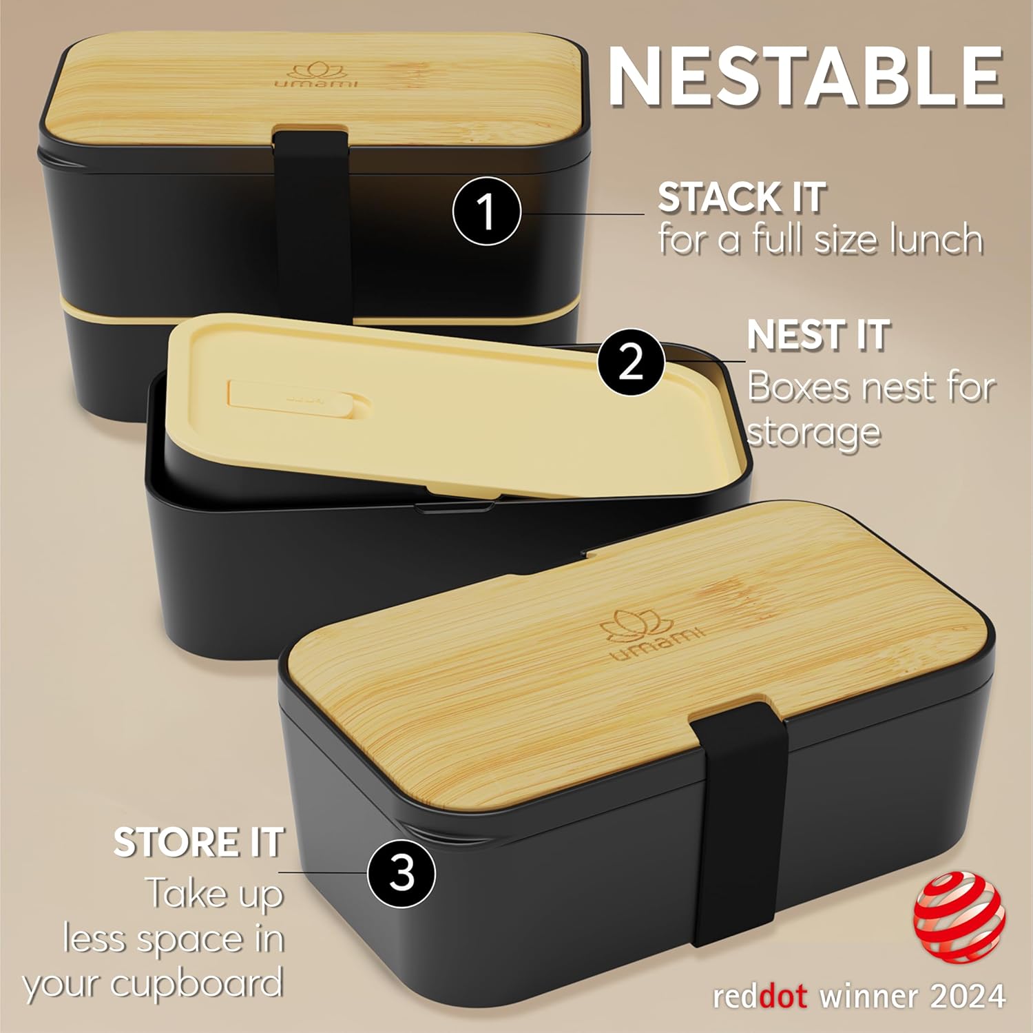 - Everything you need. Nothing you donβt. This all-in-one bento lunch box includes a full cutlery set, 2 sauce jars, and a clever nestable design. No clutter. No forgotten forks. Just grab and go