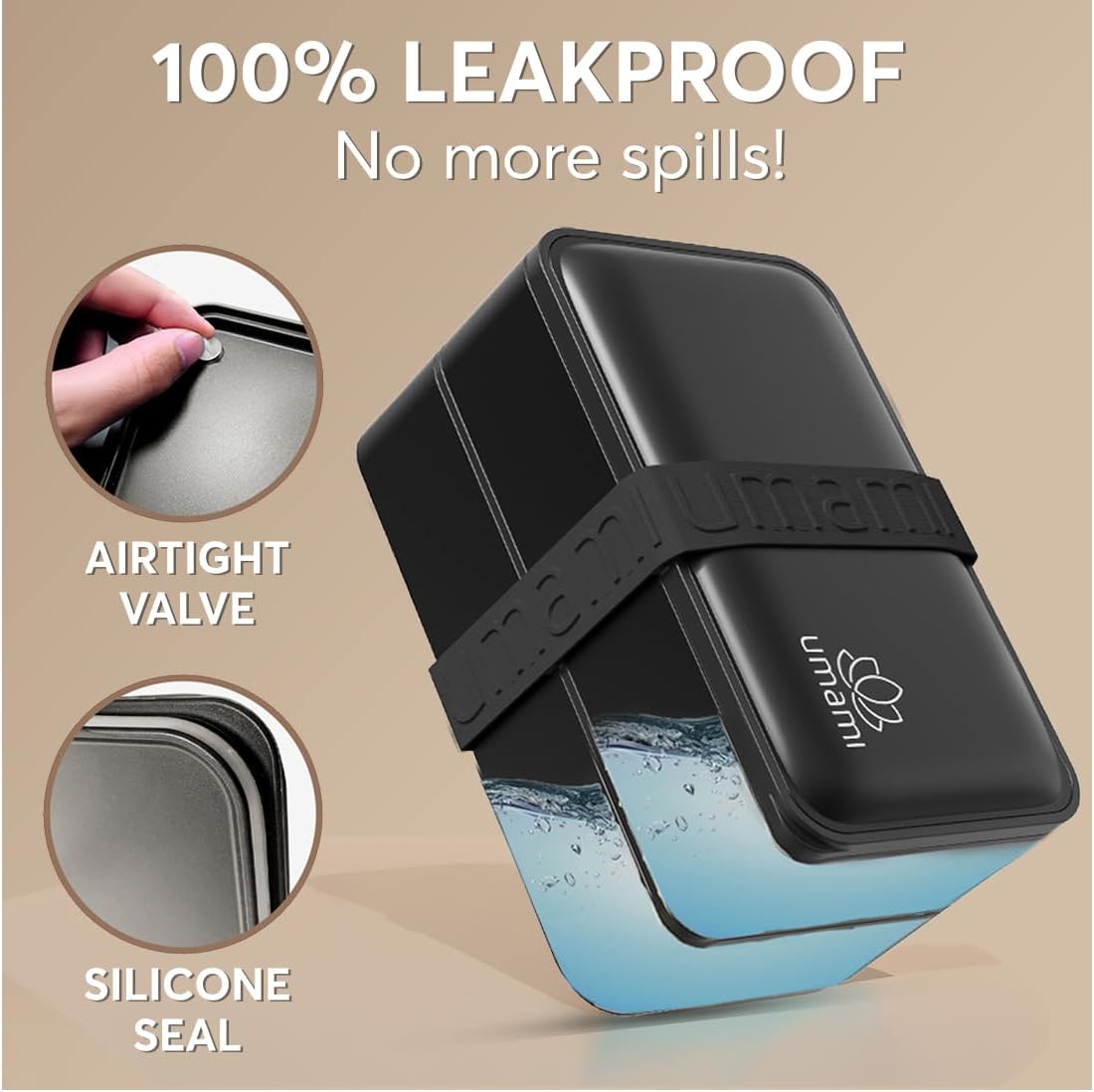 Umami Bento Box Adult All-In-1 w/4 Utensils, Sauce Jar, 2 Dividers, 100% Leakproof, Microwave & Dishwasher Safe, Stackable Bento Lunch Box Containers for Men/Women, Matte Black, 40 oz