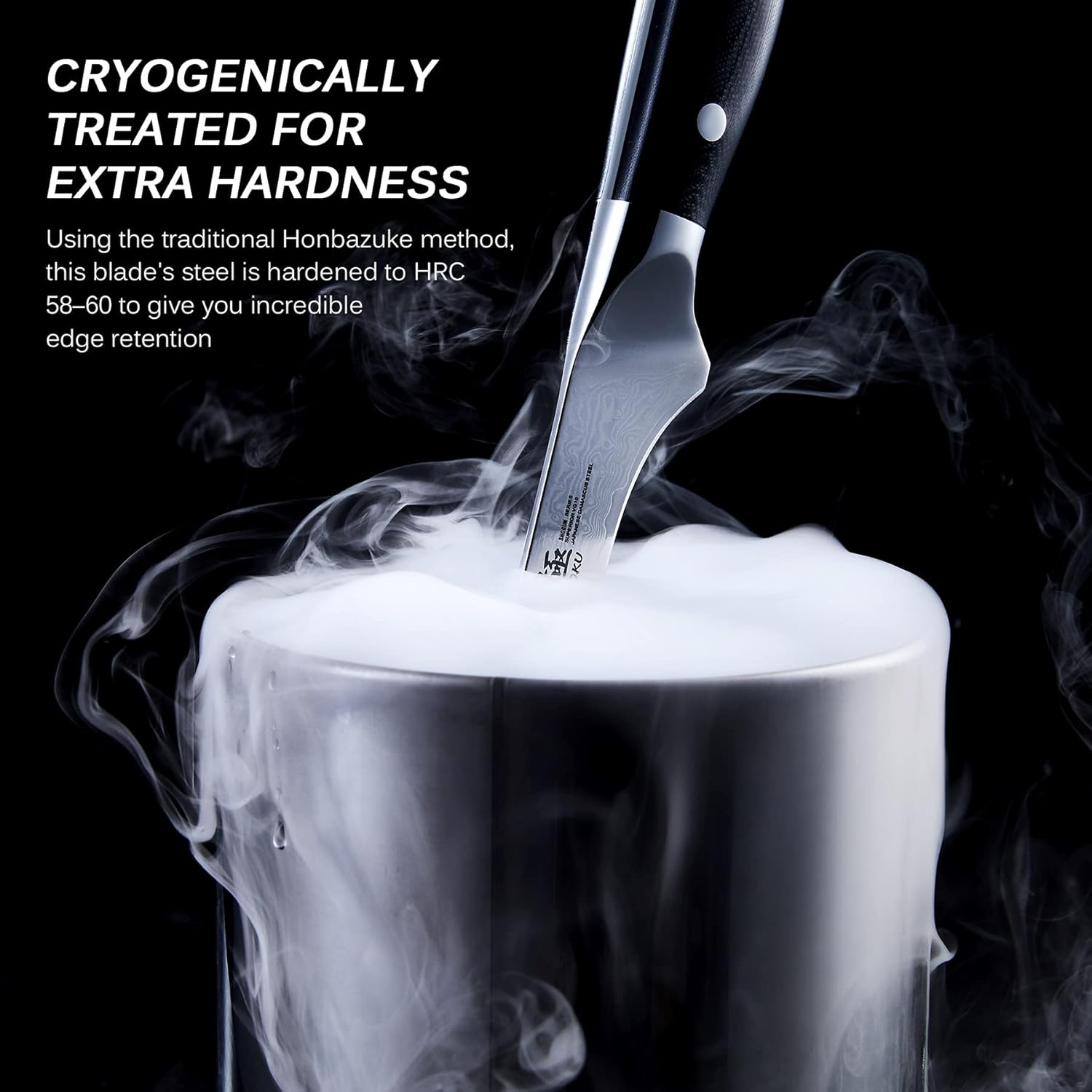 - SUPERIOR SHARPNESS - Ruthlessly sharp scalpel-like edge is handcrafted by seasoned artisans to a mirror polish at 8-12° double side using the traditional 3-step Honbazuke method; Nitrogen cooled for ultimate hardness, flexibility and corrosion resistance performance