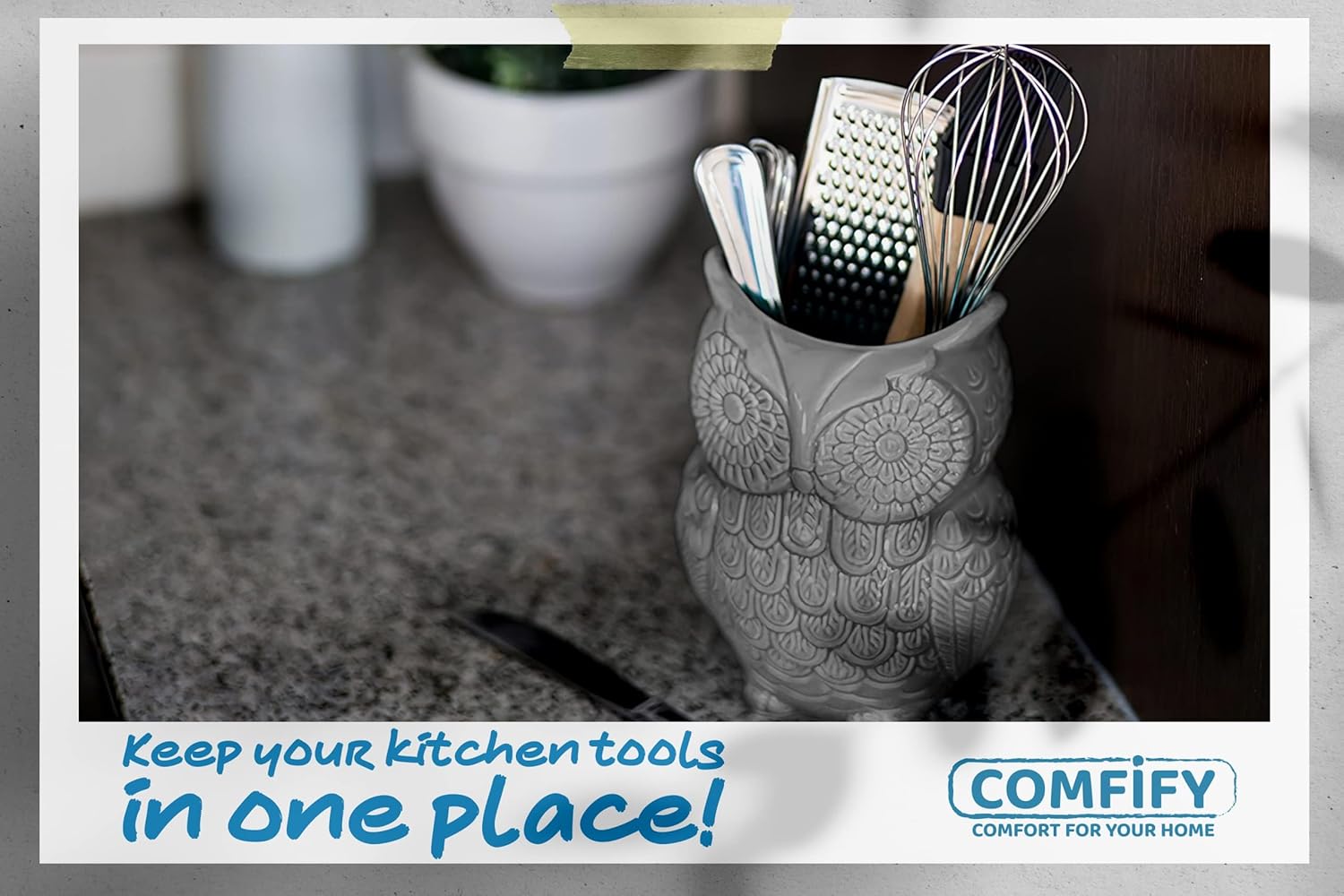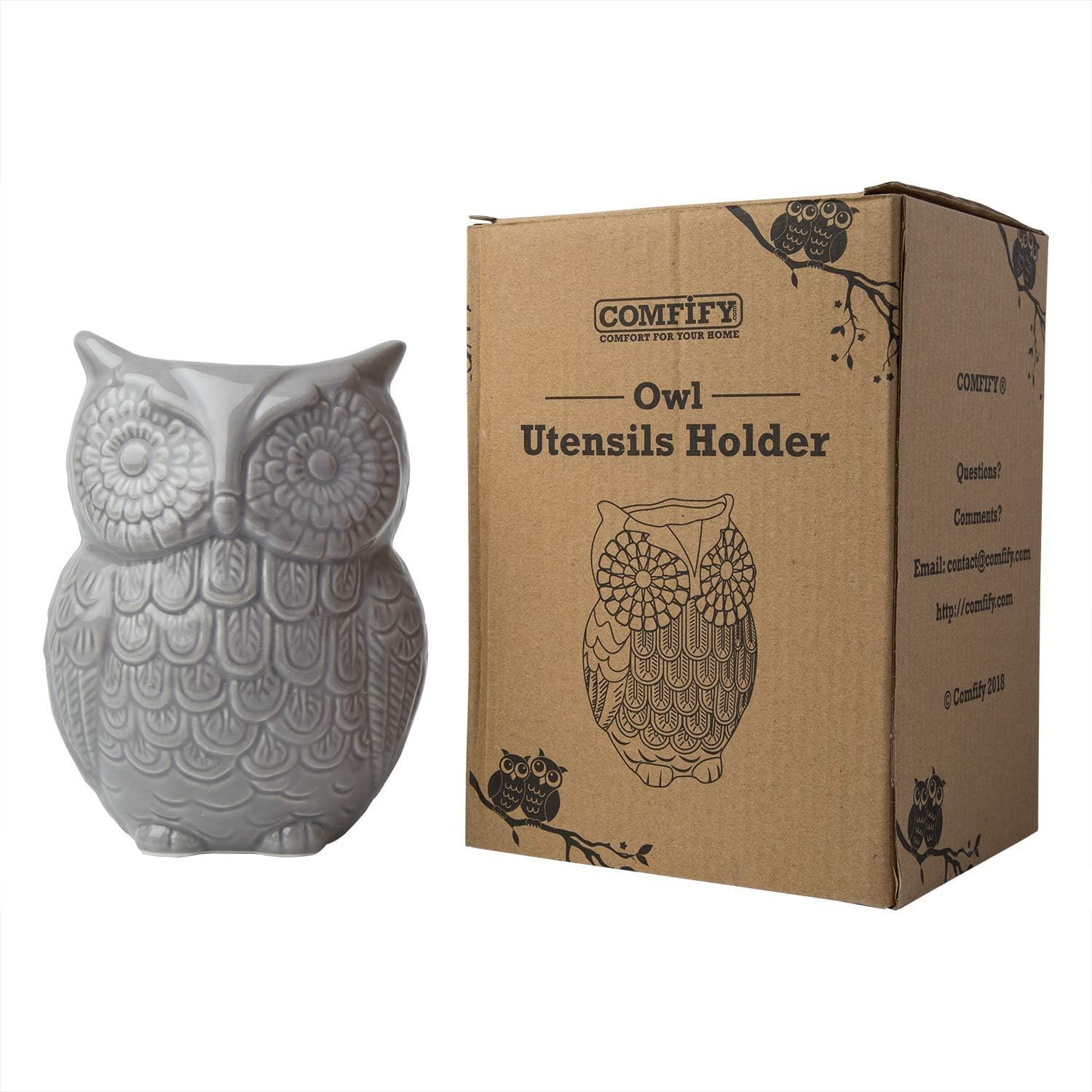 Owl Utensil Holder Decorative Ceramic Cookware Crock & Organizer, in Lovely Grey Color - Utensil Caddy and Perfect Kitchen Ceramic Decor Gift - 5" L x 7" H x 4" W