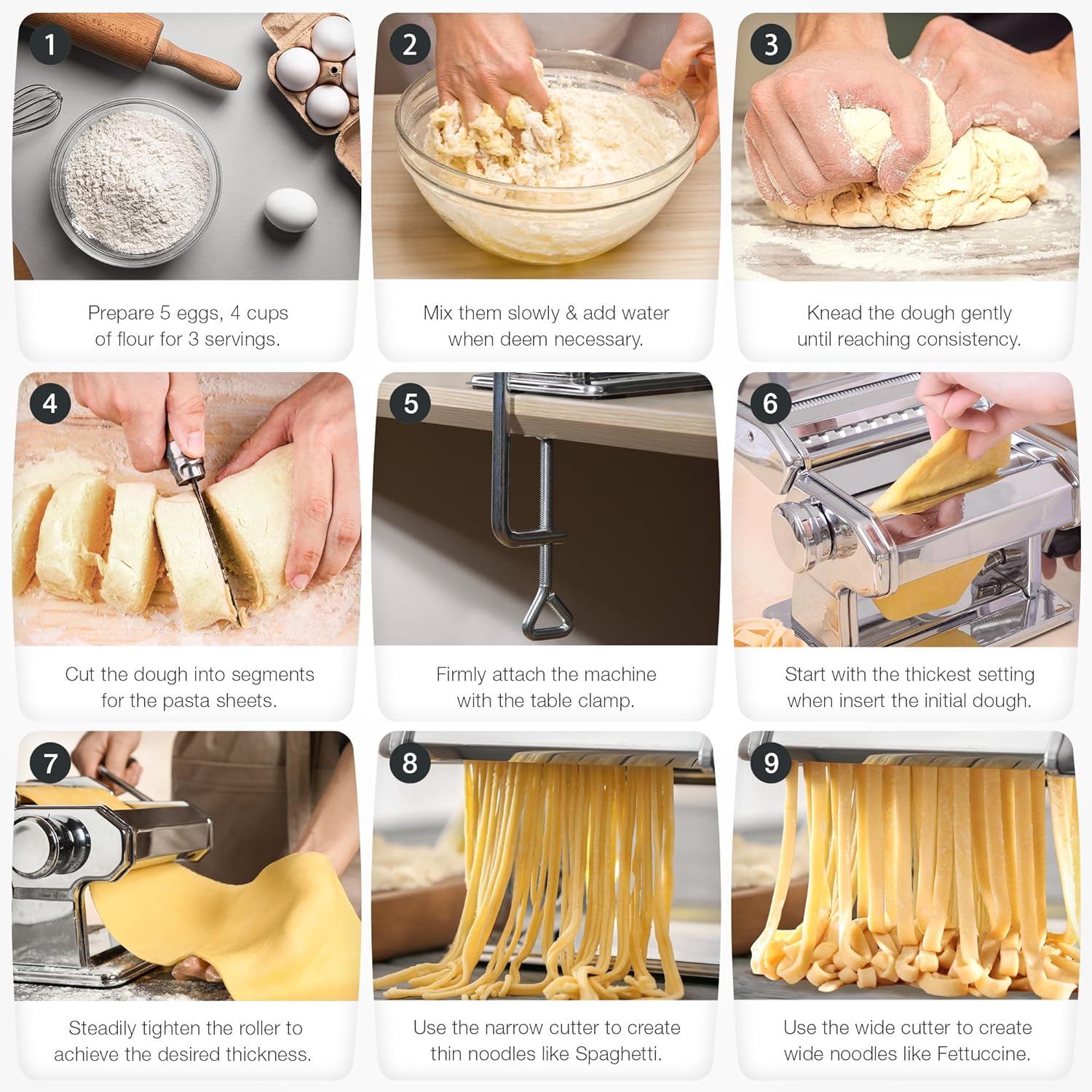 - FOOD-GRADE MATERIAL & STURDY DESIGN: Its pasta rollers and pasta cutter are made of high-quality and non-toxic aluminum alloy, thus guaranteeing its safety and durability; innovatively designed with a sturdy table clamp, it will not move around when in use.