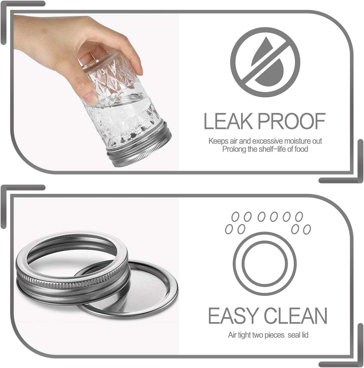 - EXCELLENCE IN QUALITY:Thick 8oz VERONES glass jars comes with food-safe, corrosion resistant lids - material meets certified safety standards.Each jar comes with a time tested airtight ceiling compound to help ensure a quality seal with each lid making them suitable for use in preserving and canning. Safe for the refrigerator and the freezer