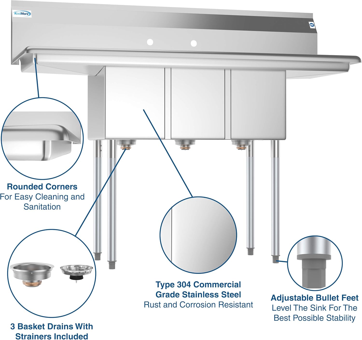 KoolMore - SC101410-12B3 3 Compartment Stainless Steel NSF Commercial Kitchen Sink with Right and Left Drainboards - Bowl Size 10" x 14" x 10", Silver
