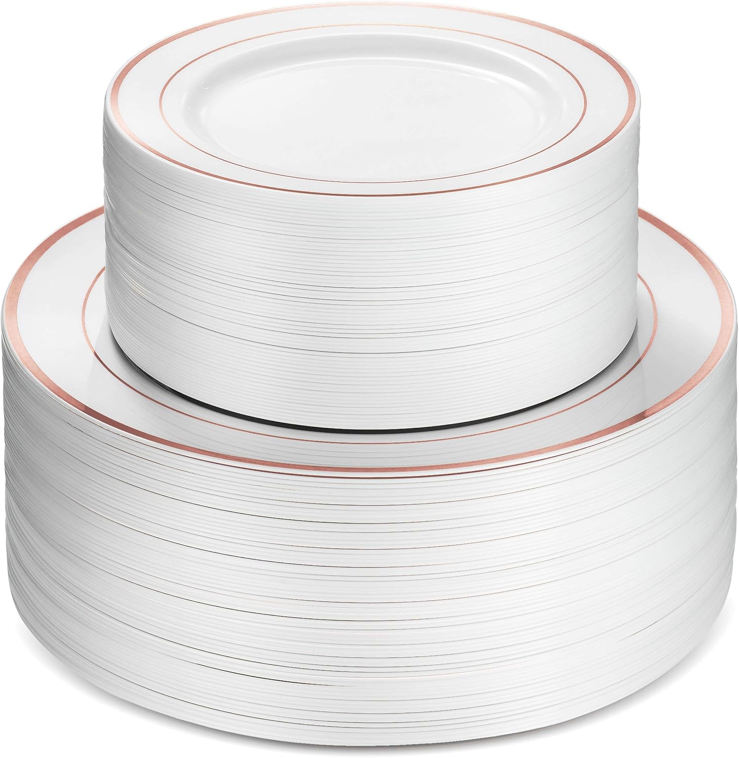 Munfix 100 Rose Gold Rim Plastic Plates Set, 50 Pcs 10 Inch Dinner and 50 Pcs 7 Inch Plastic Dessert Plates, Elegant Fancy Heavy Duty Disposable Plates for Party, Wedding, White Rose Gold Rim