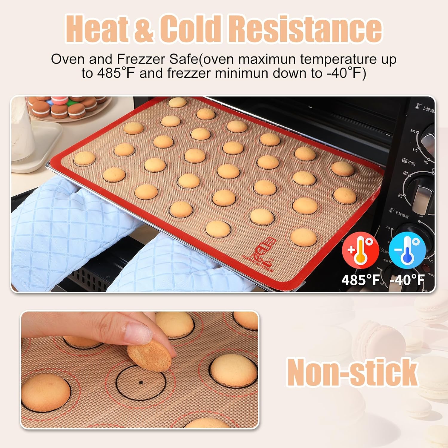 - Versatility: Oven/Microwave/Dishwasher/Freezer Safe: Macaron mat is made from highest food grade liquid silicone and can be used at temperature ranging from -40°F to 485°F (-40 to 251°C). Perfect for baking, candy/macaron/pastry/cookie/bun/bread. Also for table/placement mats.