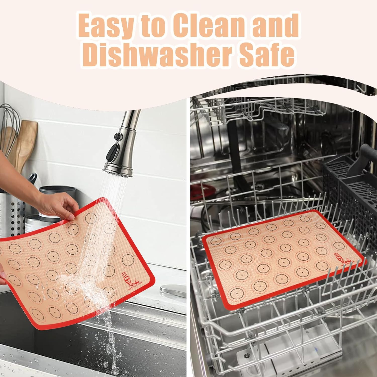 - Non Stick and Easy to Clean: These silicon mats are made from food grade liquid silicone with fiber glass, so you will enjoy the non-stick baking mat if you buy them now. No more scrubbing! Even burnt sugar and fat falls off on its on. Just rinse the washable and reusable mat in warm soapy water to clean it and dishwasher safe.