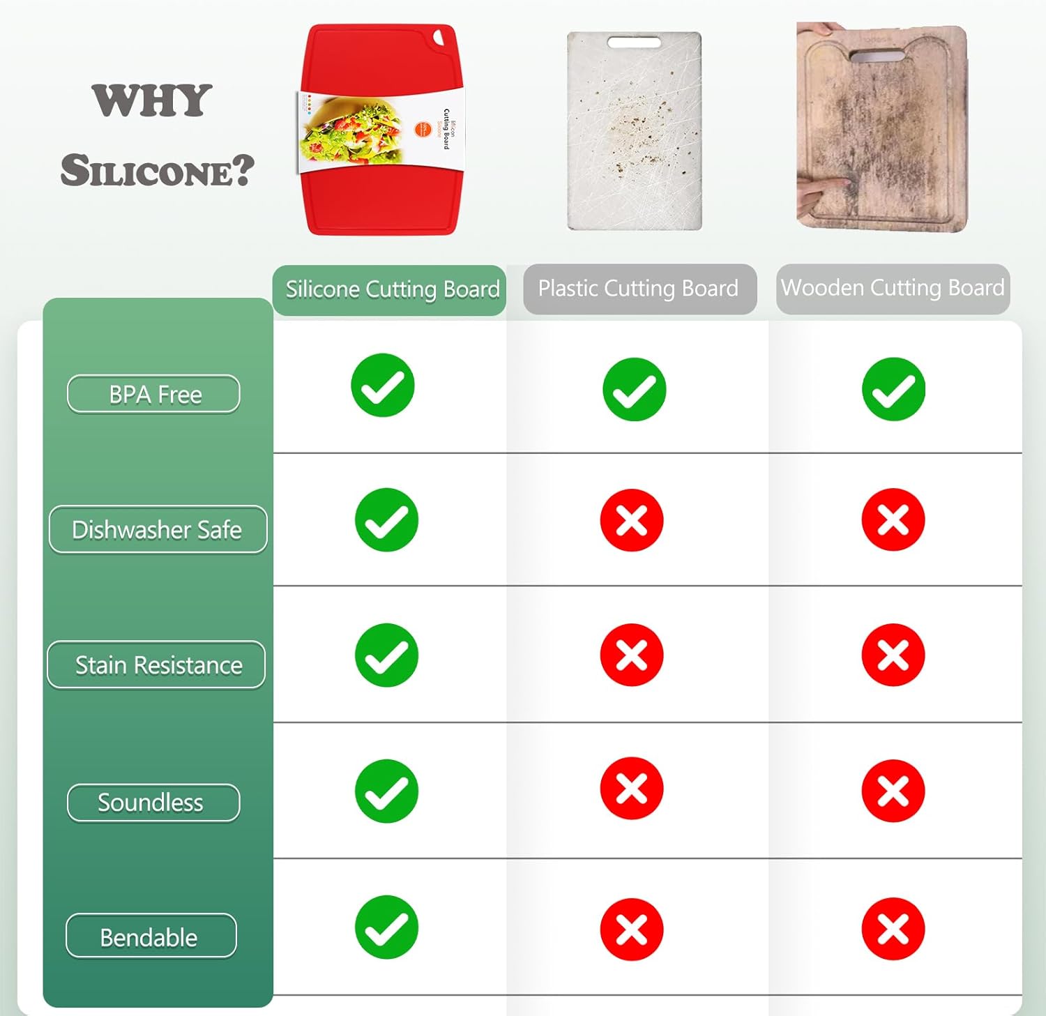 - 【THICK AND FLEXIBLE DESIGN】: Non-Stick & Non-Toxin Flexible Silicone Cutting boards, flexibility and durability allows for easy transfer from chopping to bowl and makes sure that you won't cut through our cutting boards and that they will not wear out as quickly or easily as the others.