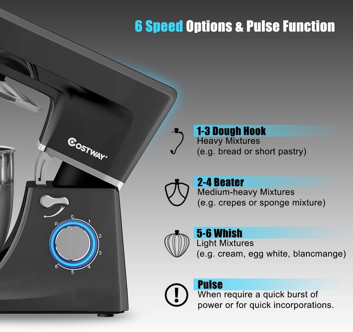 - TILT-HEAD & ANTI-SLIP DESIGN------The tilt-head design mixer allows access to install or uninstall bowl and its attachments easily by an easy-to-control knob, which also convenient for you to add ingredients for a recipe. Anti-slip suction cups are specially designed to keep mixer balanced and steady while working.