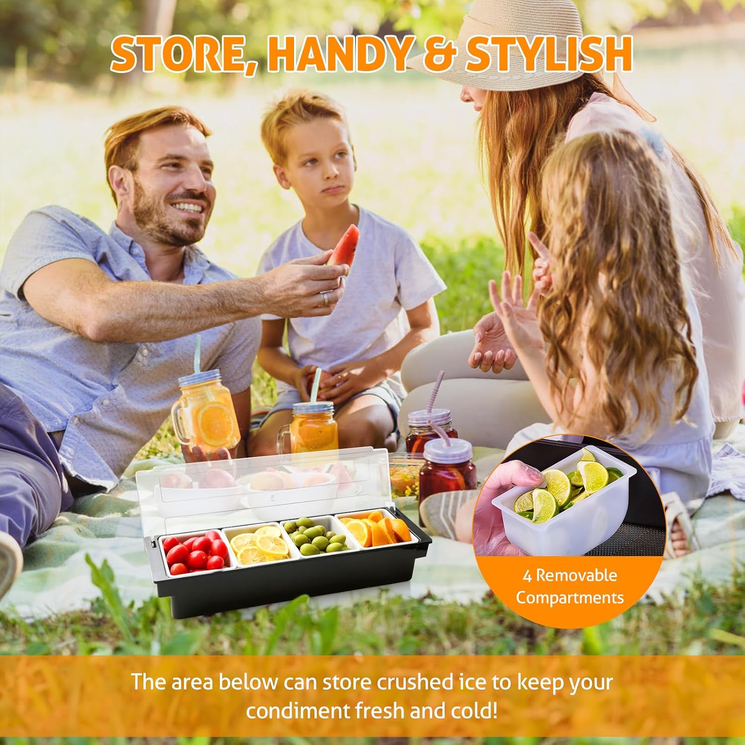 WICHEMI Condiment Container with Lid Ice Chilled Condiment Server with Ice Tray Fruit, Veggie & Condiment Caddy Plastic Garnish Station for Bartending Serving Taco, Salad Bar Container (4 Compartment)