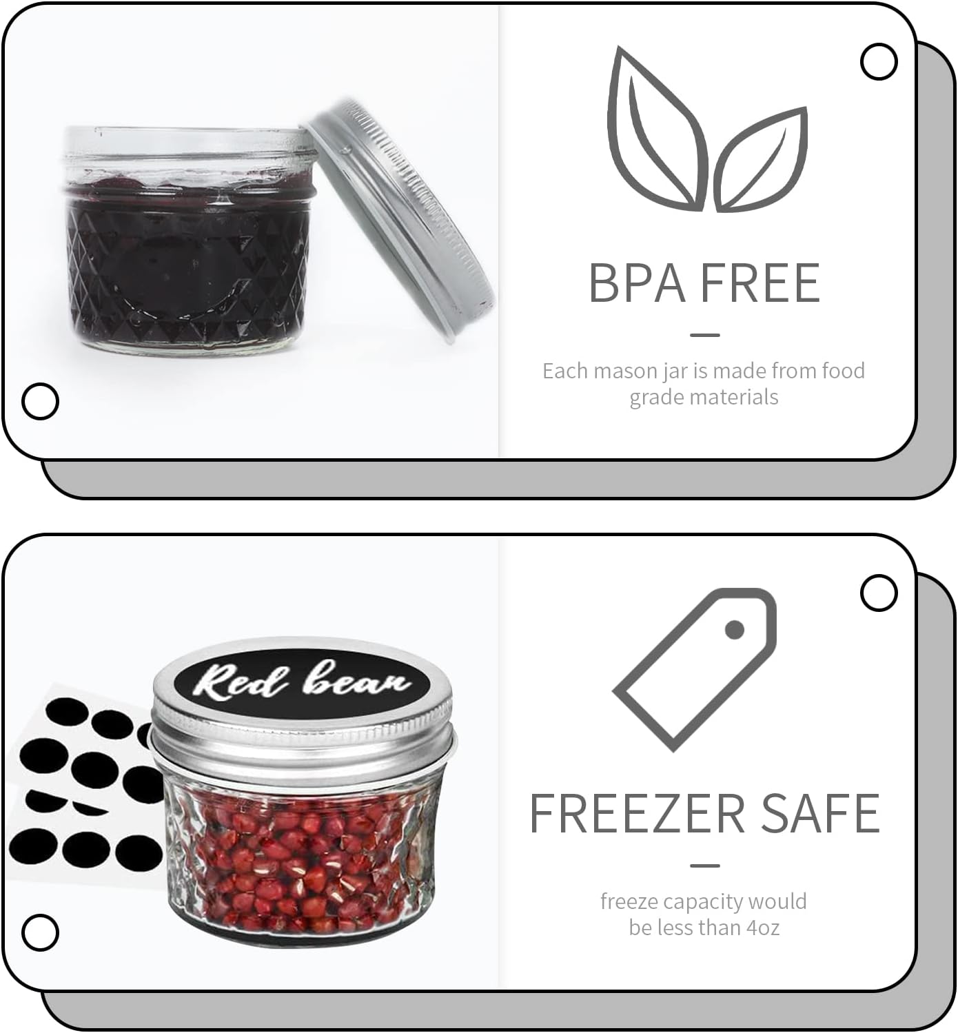 - FOOD GRADE:Each mason jar is made from food grade materials.Great for food storage.Suitable for use in preserving and canning. Safe for the refrigerator and the freezer