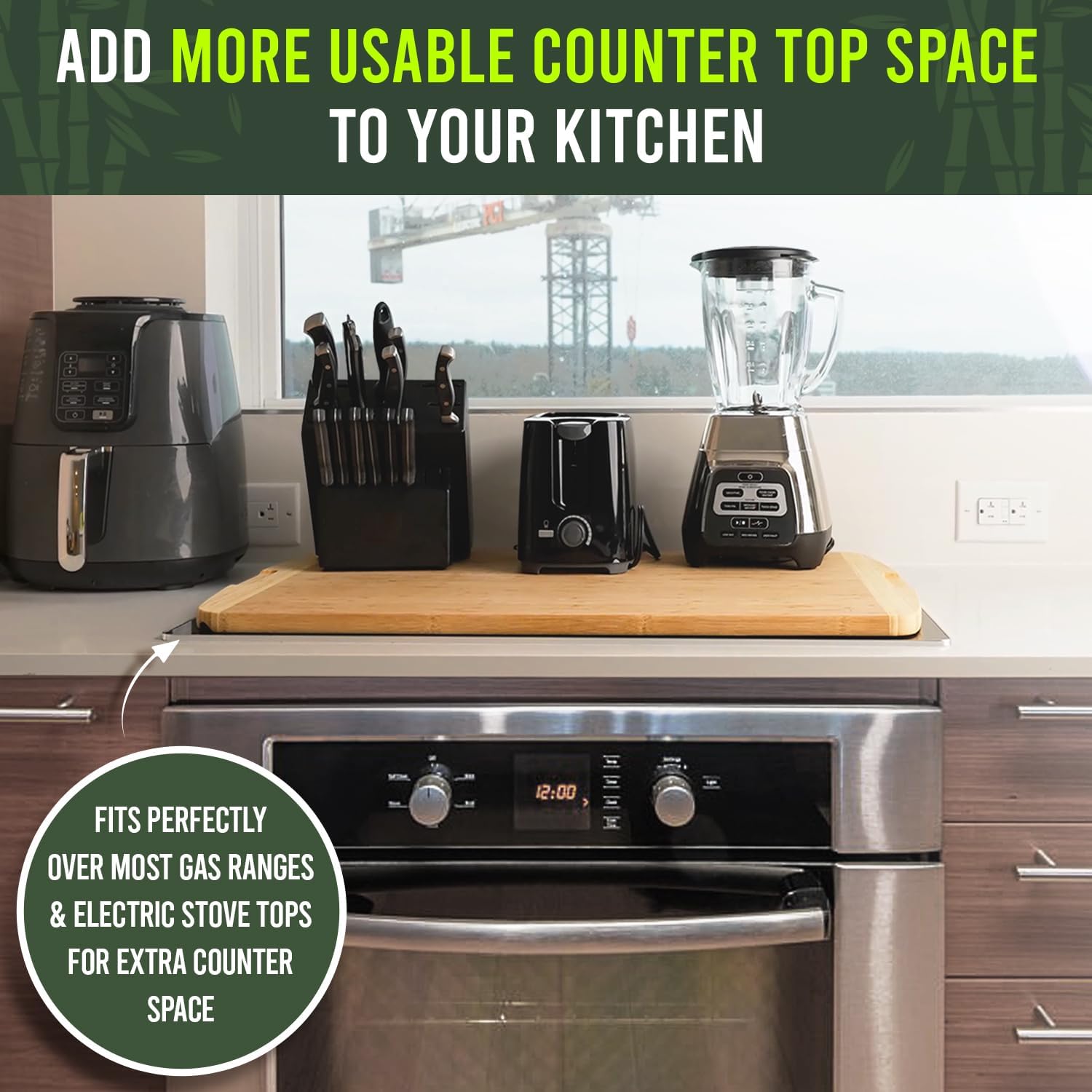 - CUTTING BOARD + STOVETOP COVER – Transforms unused stove top into extra counter space in seconds. Perfect for small kitchens, RVs, and apartments – adds function and beauty to your kitchen. It also works great as an over the sink cutting board.
