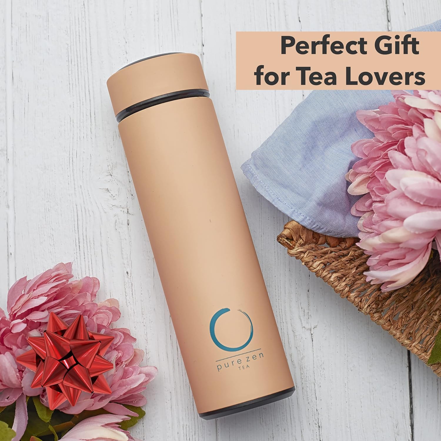 Pure Zen Tea Thermos with Infuser for Hot and Cold Infusions - Stainless Steel - Tea Infuser Bottle - Leakproof Travel Mug with Filter - 15oz - Pink