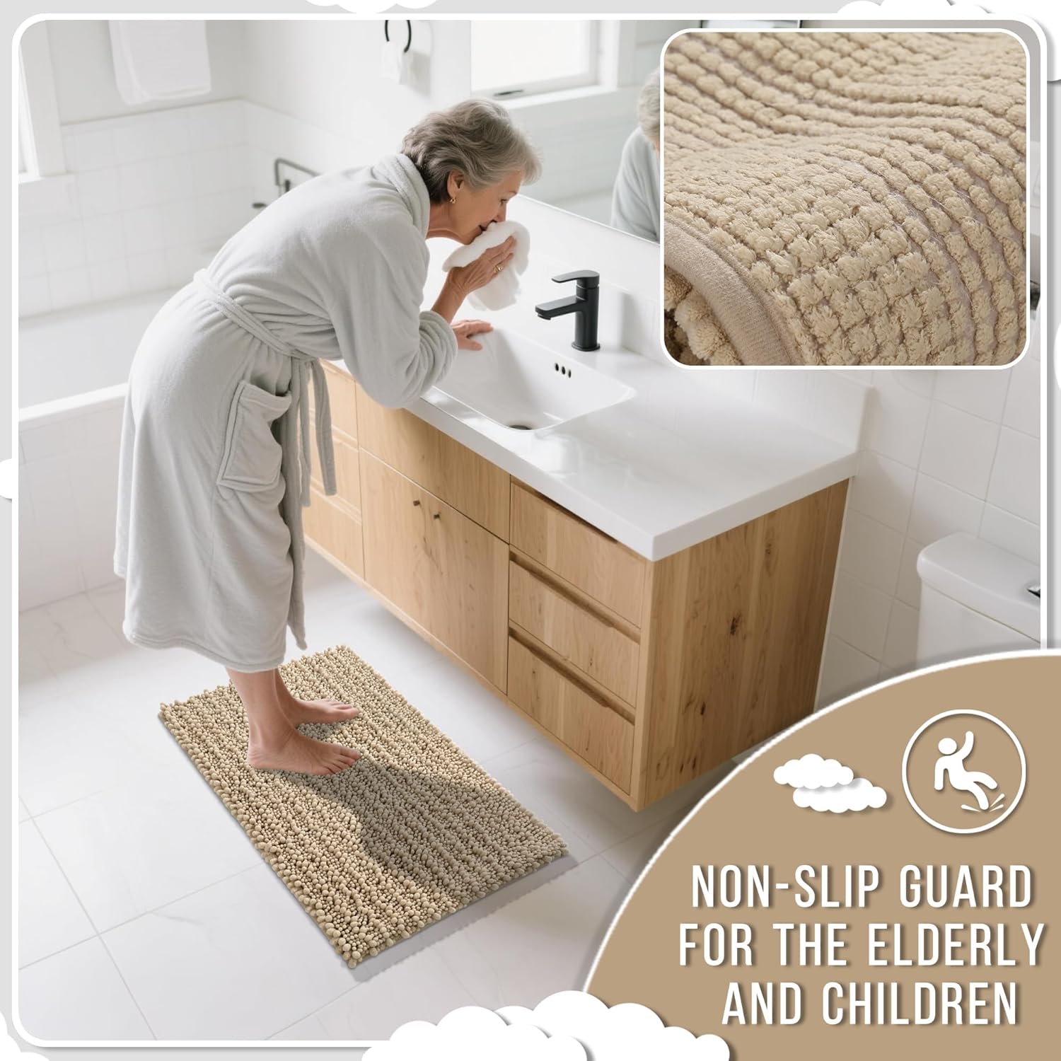 Yimobra Long Bathroom Rugs Non Slip Washable 44x24 Inch - Ultra Soft Absorbent Chenille Bath Mat, Quick Dry Shaggy Floor Carpet for Tub Shower, Pale Khaki Home Decor Accessories