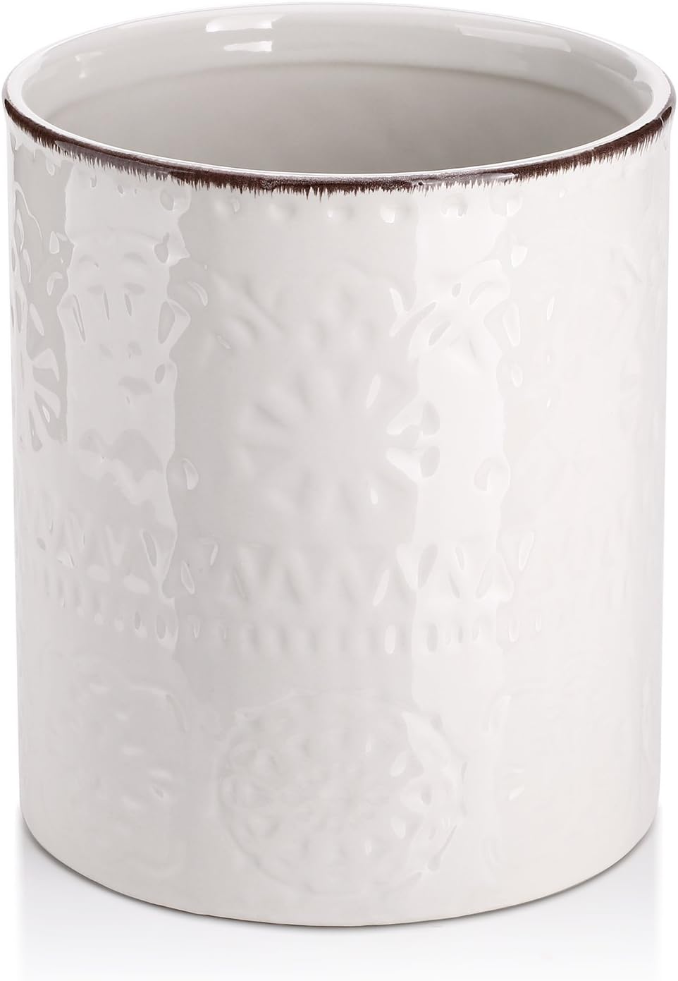 - Dimpled Imprint Fits Your Kitchen DΓcor. Beautiful design, awesome color and modern look must be a perfect and elegant compliment to your kitchen. This farmhouse white utensil holder for countertop will catch your eye at first sight.