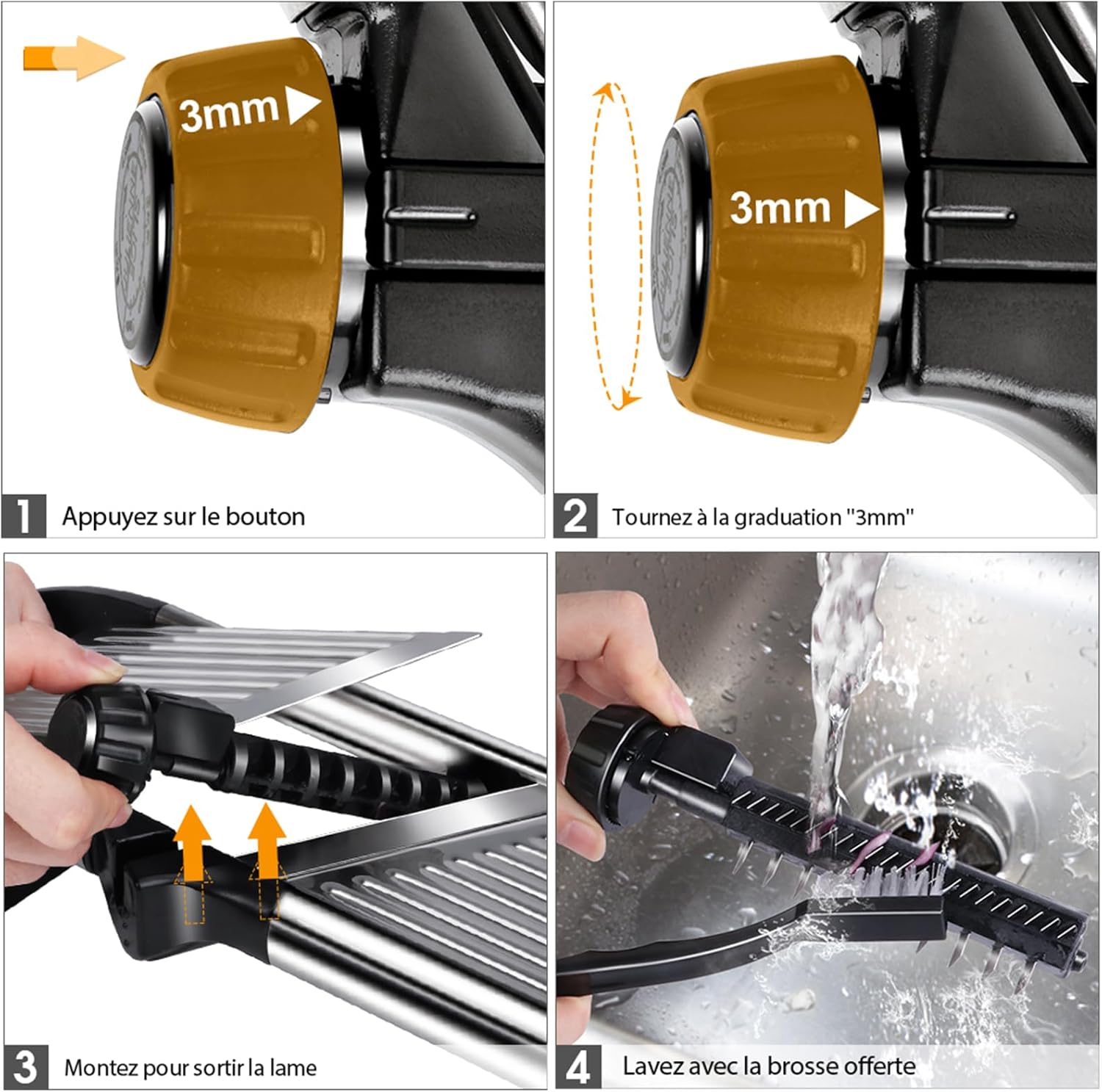 - Versatile & Practical:With built-in design blade, if need to adjust thickness or change cutting options, just adjust button, no need to touch the blade, spend less time and make cooking faster and easier.