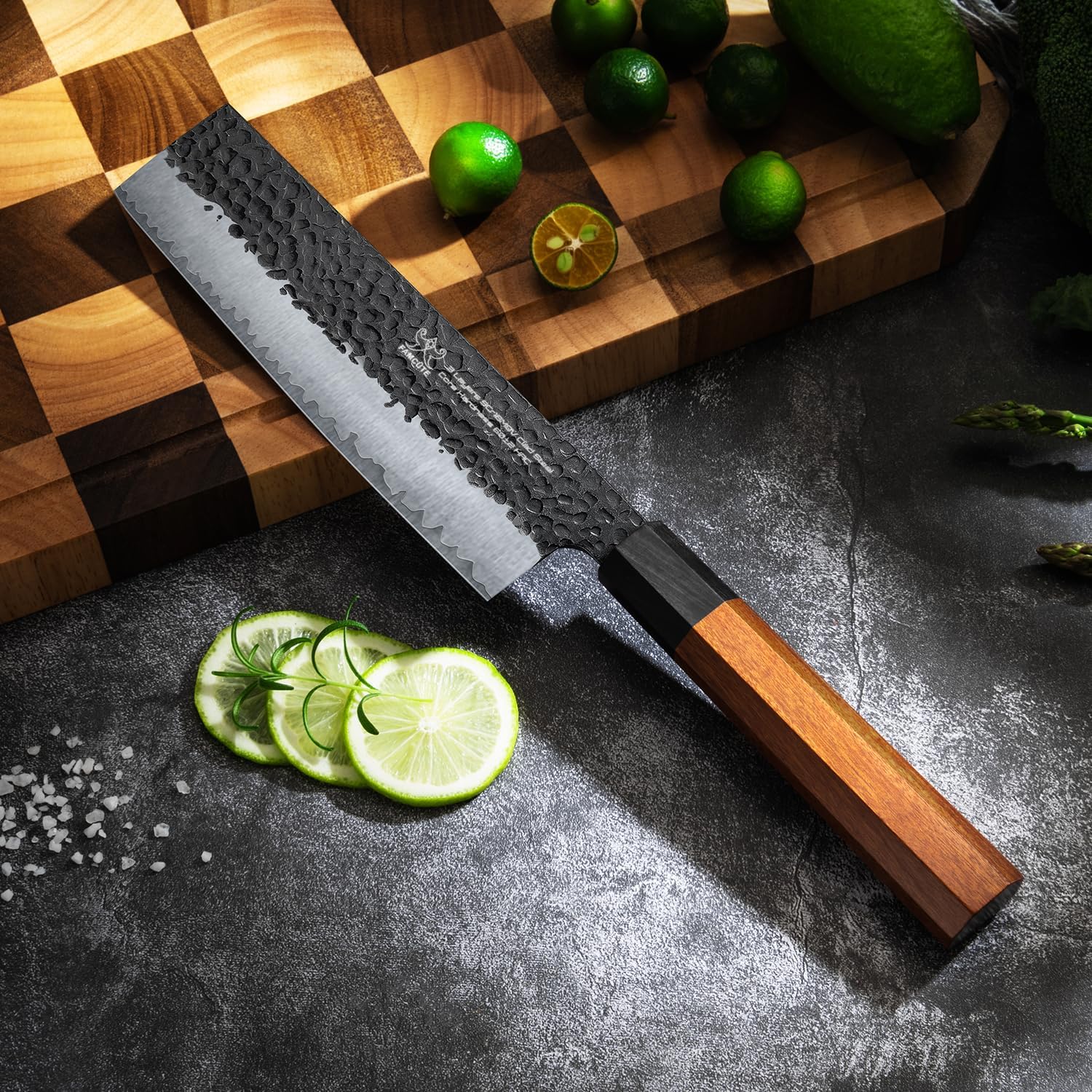- Quick Vegetable Cutting - The non-slip octagonal handle provides excellent balance and flexibility for japanese nakiri knife, making them ideal for heavy-duty tasks such as slicing, dicing, mincing, and chopping. The straight blade design offers intuitive use with less rocking motion, significantly reducing vegetable prep time.