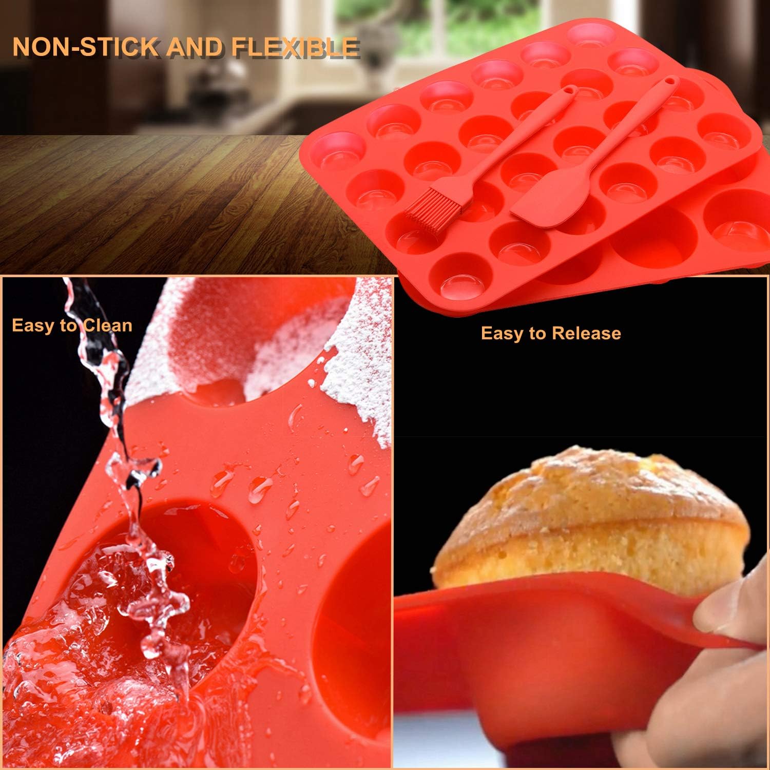 Silicone Muffin Pan Cupcake Set, Non-Stick Regular 12 Cups and Mini 24 Cups,Silicone Baking Molds,BPA Free Muffin Tin with 1 Silicone Spatula & 1 Oil Brush (Red)