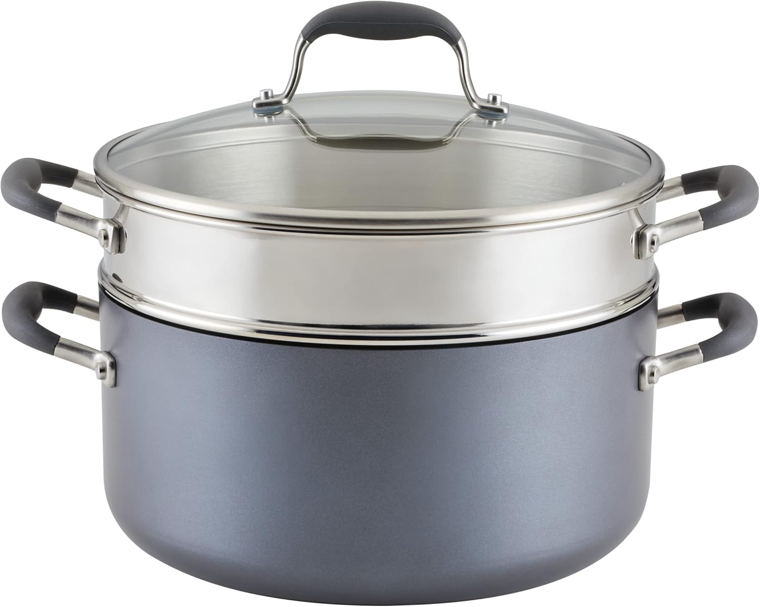 Anolon Advanced Home Hard Anodized Nonstick Wide Stockpot with Stainless Steel Steamer Insert and Glass Lid, 3 Piece Cookware Steamer Set, Moonstone