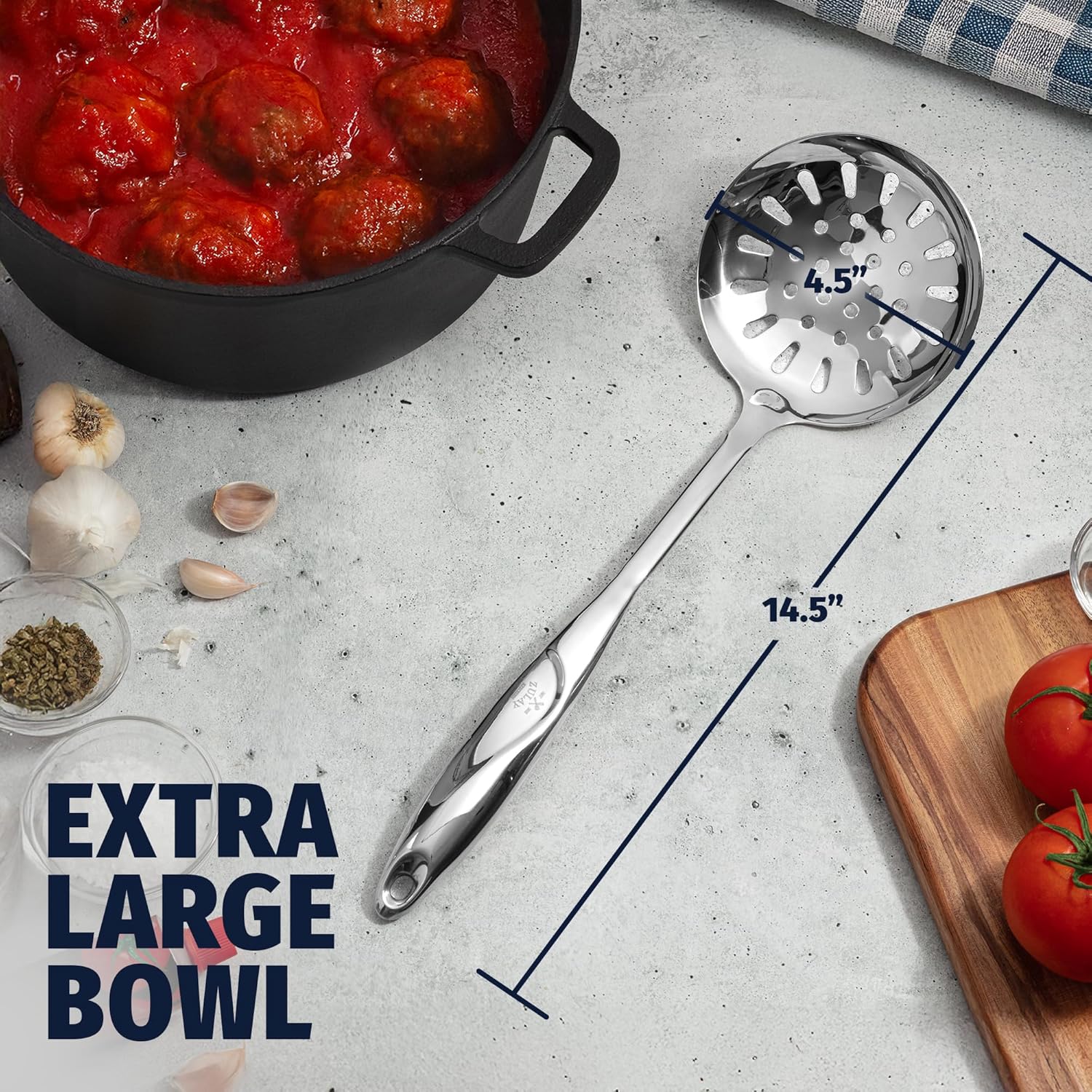 - COMFORTABLE & SAFE GRIP: We have designed this lightweight slotted spoon with an ergonomic handle that is comfortable for any cook in the kitchen. Our 14.5 inch cooking spoon allows you to keep a safe distance from hot oil or boiling water while you cook. It is also heat-resistant and contributes to a safe cooking environment.