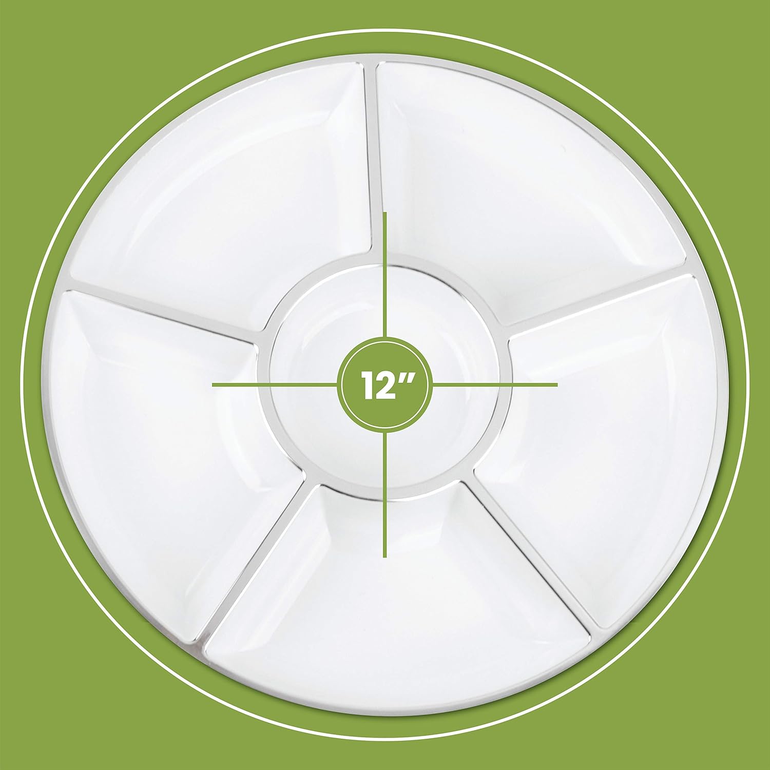 - SIZE 12” round serving plate consists of 6 divided sections with a center dip section which is excellent for serving snacks and appetizers. Its each section are amply sized for chips and salsa, veggies and dip, shrimp and cocktail sauce and much more