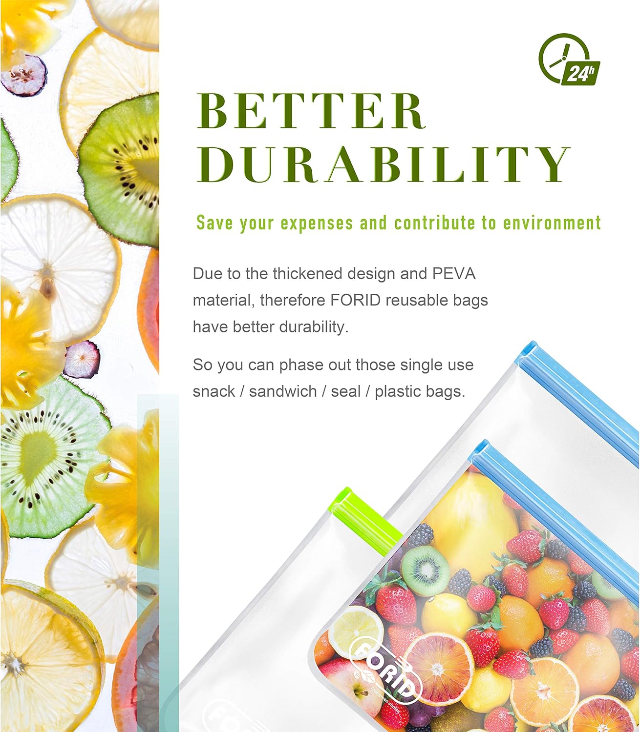 - Food Grad Material - FORID 1 gallon storage bags feature upgrade FDA food-grade & eco-friendly PEVA material, which is silicone & plastic-free, PVC-free, chloride-free, BPA-FREE and without the danger of harmful chemicals so that you can store food and personal items safely and worry-free.