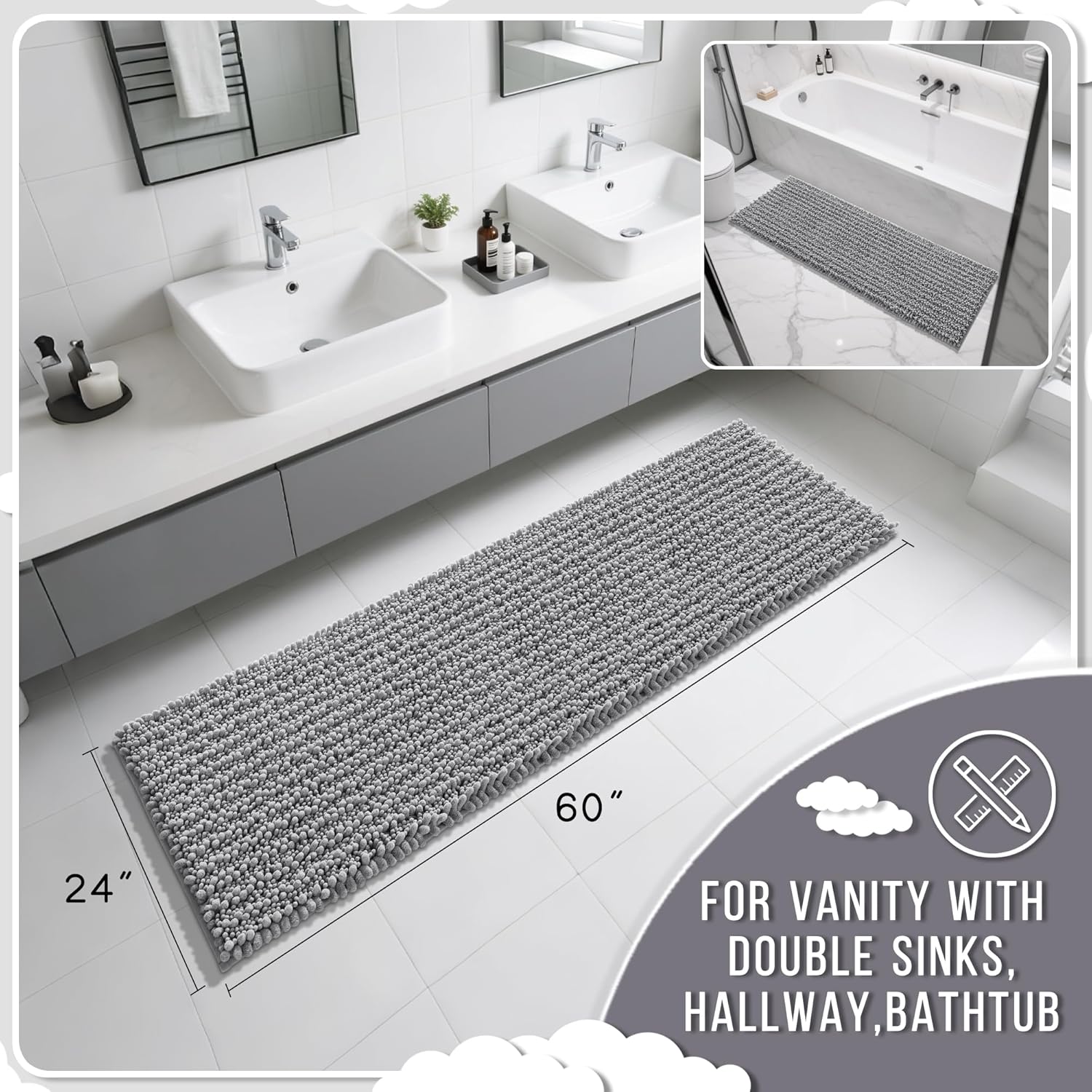 Yimobra Bathroom Runner Rug 60x24 Inch - Extra Long Non Slip Chenille Bath Mat, Soft & Absorbent, Machine Washable Shaggy Hallway Carpet for Vanity Tub Shower, Gray Home Decor Accessories