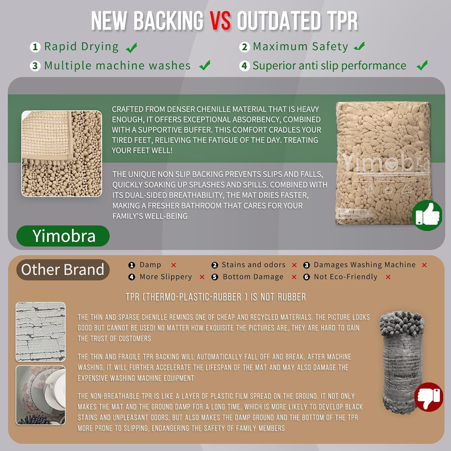 - Total Grip Safety & Quick Dry: Yimobra bath rug features a feather-light yet ultra-grippy hot-melt backing that stays firmly in place on wet surfaces. Its vertical air-channel chenille fibers ensure rapid and complete dryness, providing instant dry safety the moment you step out of the shower. The product is tested for harmful substances, performance, longevity, and emissions in accordance with the OEKO-TEX Standard 100