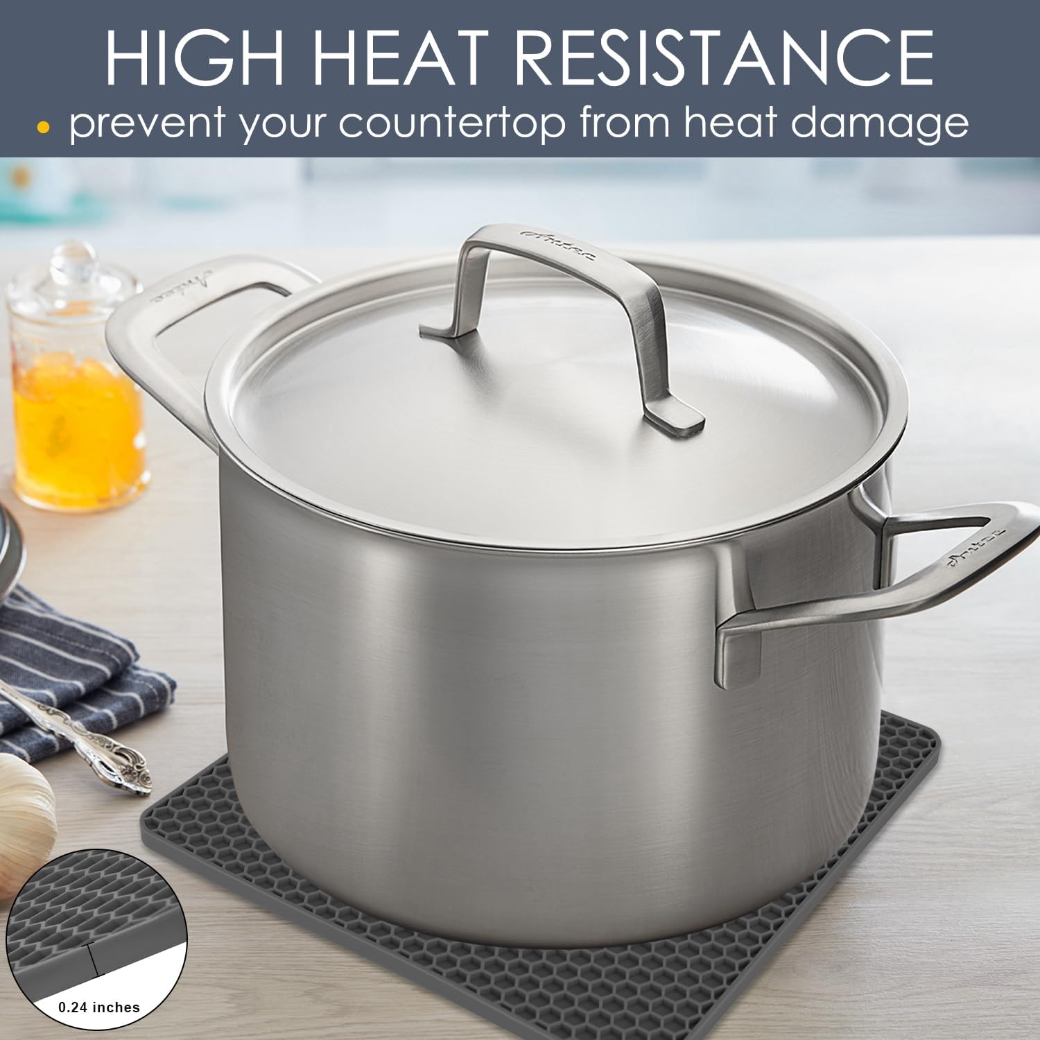 - 💝【SMART DESIGN 】- Unique honeycomb designed silicone hot pads set takes over the water and with great texture prevent water droplets from the counter and anti-slip and also easy to dry by squeezing out or shaking And the honeycomb pattern not only decreases the weight, but also evenly distributes heat and offers a firm grip while.