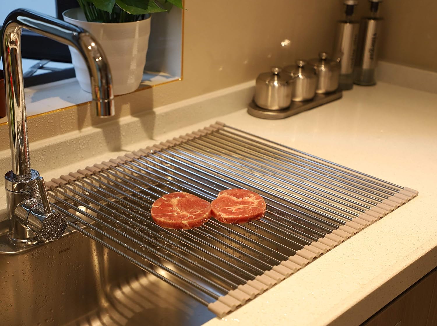- Newest Displayed Dimension: 20.5"(L) x 19.7"(W) X 0.5'' (H). SUS304 Stainless Still Pipes. Please kindly measure your sink size firstly before purchasing this roll up over the sink dish drying rack! Great Gift for Mother's Day, Father's Day, Christmas Day, New Year, family members and all festivals Gifts