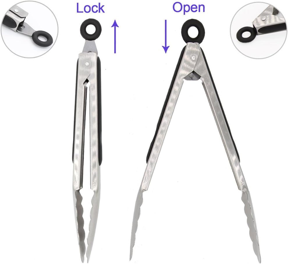 304 Stainless Steel Kitchen Cooking Tongs, 14" and 16" Set of 2 Sturdy Grilling Barbeque Brushed Locking Food Tongs with Ergonomic Grip, Black
