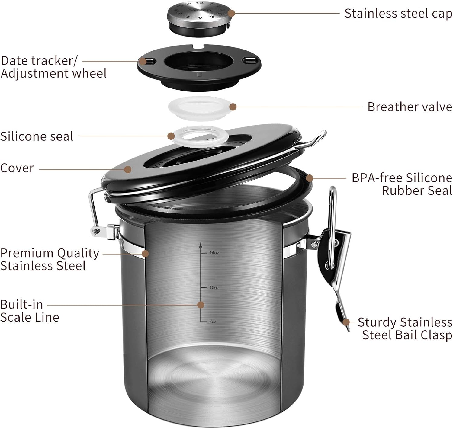 - Date Tracker & Free Scoop - Ensure your coffee is always fresh and not expired. You can set the storage or expiry dates with the date tracker on the lid of your Veken coffee storage canister. We also offer a free stainless steel coffee scoop, which can be attached to the hook!