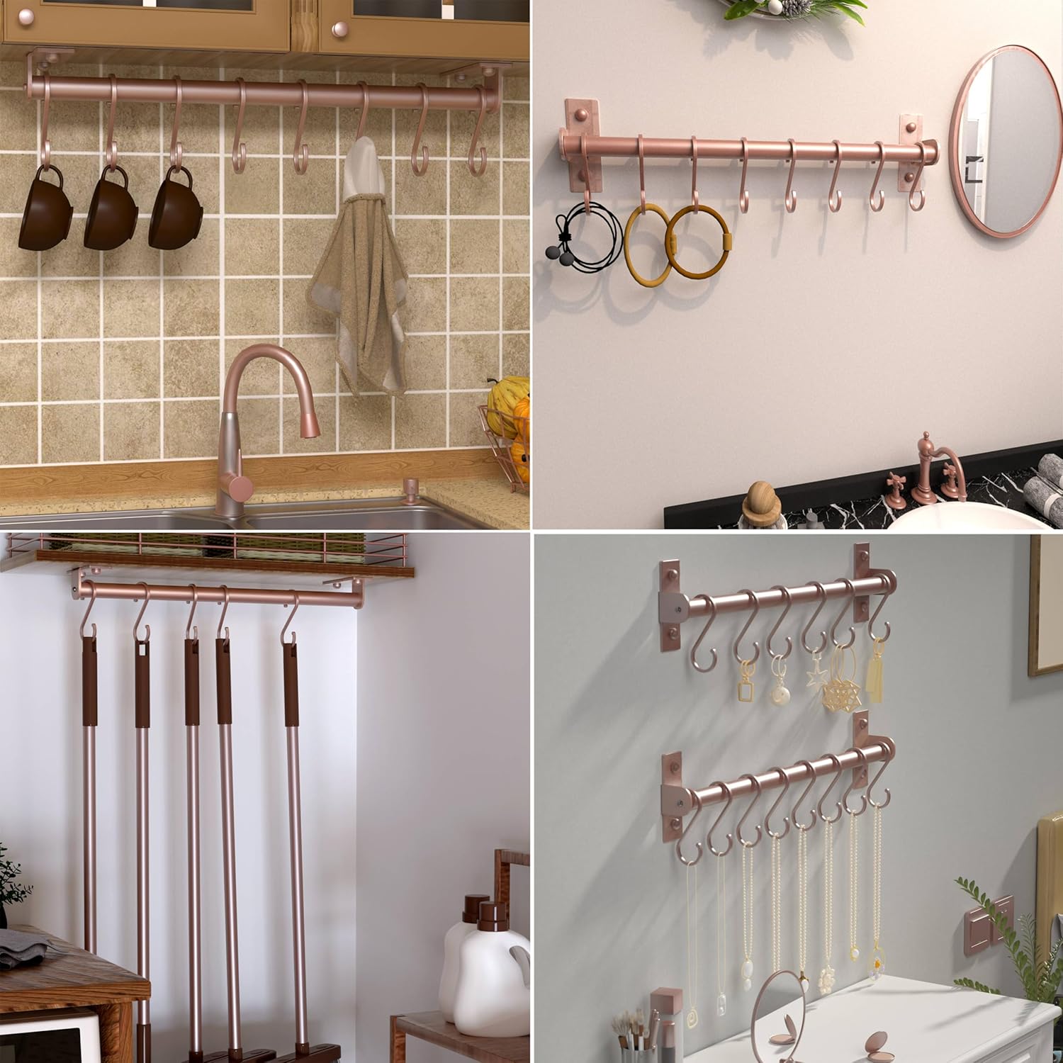 - Easy to install, sizes: 15-3/4 L x 4-1/2 H x 1-5/8 inch, including 2 x kitchen rail with 16 S hooks, mounting hardware, rose gold color,