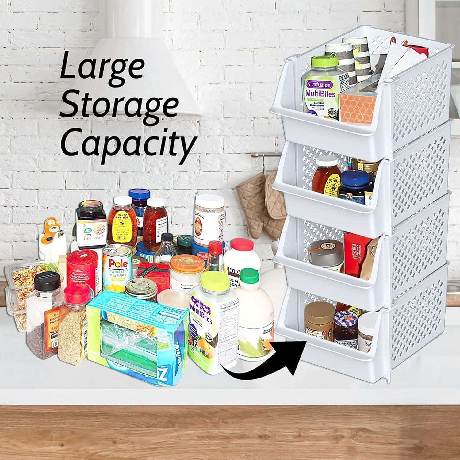 - KEEPS ESSENTIALS ORGANIZED AND VISIBLE - Stackable bins hold foods, toys, utensils, and toiletries without bending off. Set of 4, Each bin size: 11.5” x 14.5” x 7”.